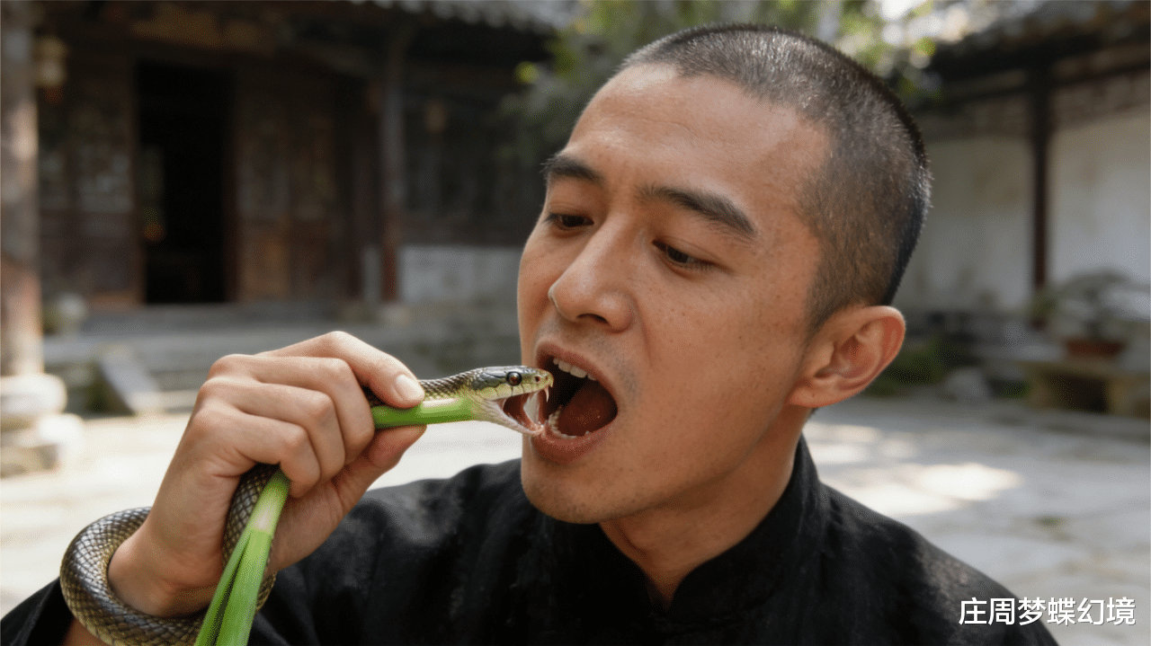 每次抓到小蛇,他就整个儿吞下去,那动作跟啃大葱似的随意;要是碰到大一点的蛇,就用刀把蛇切成一段一段的,然后捧着吃。嚼蛇的时候,嘴里发出“咯吱咯吱”的声响,蛇的血水顺着下巴往下淌。