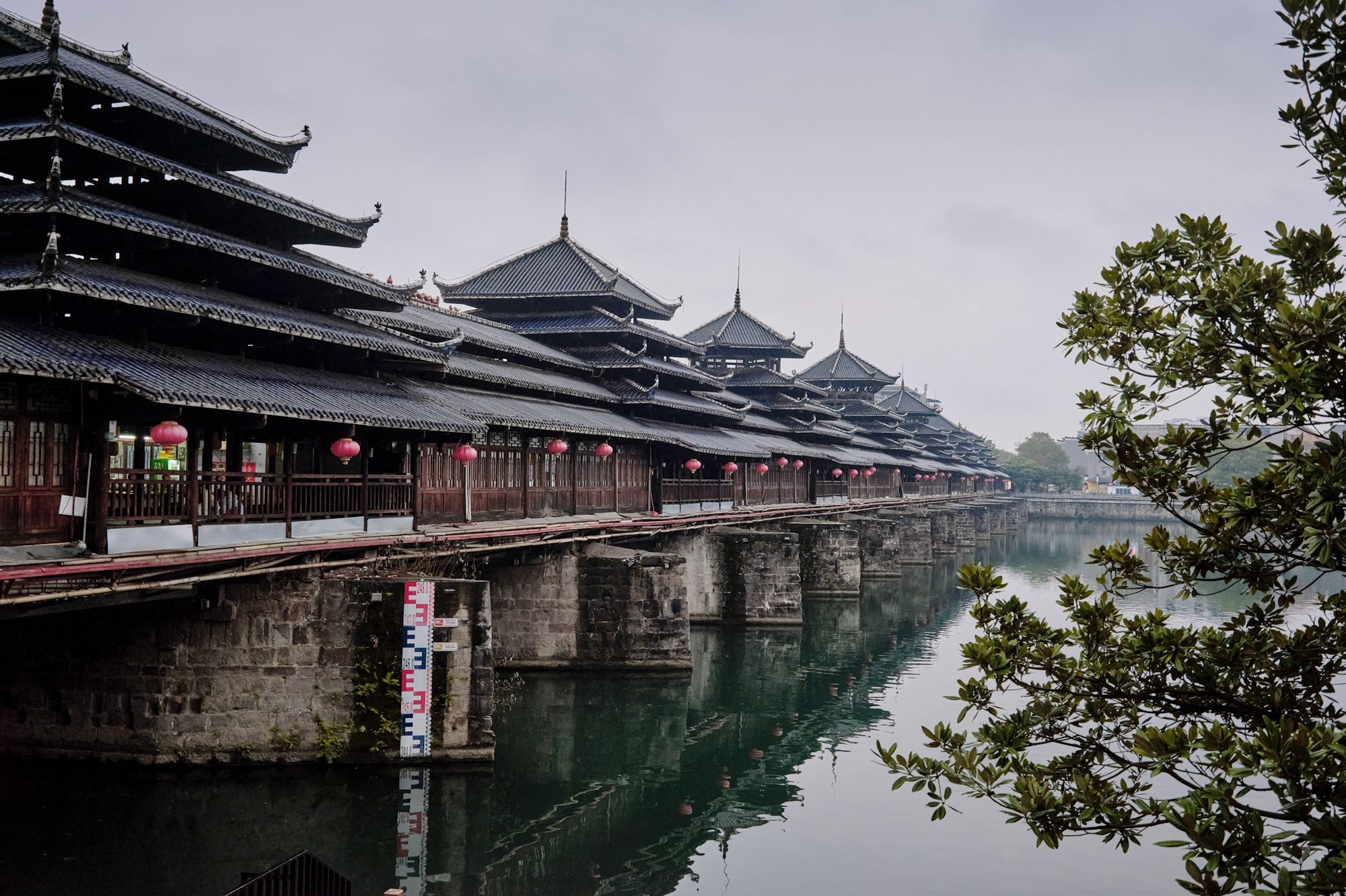 龙津风雨桥始建于明万历年间,至今已有400多年历史,整座桥梁长度近250米,从河岸望去,青色房檐一重叠一重,檐角飞翘,檐下灯笼高悬,仿佛一组建在湖波之上的重楼殿宇。