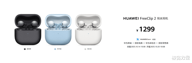 华为FreeClip 2 耳夹耳机2025年10月14日10:08开启预售,10月20日10:08正式开售,首发价格1299元,用户可登陆华为商城及各大授权电商平台或前往华为体验店、华为授权零售门店进行购买。