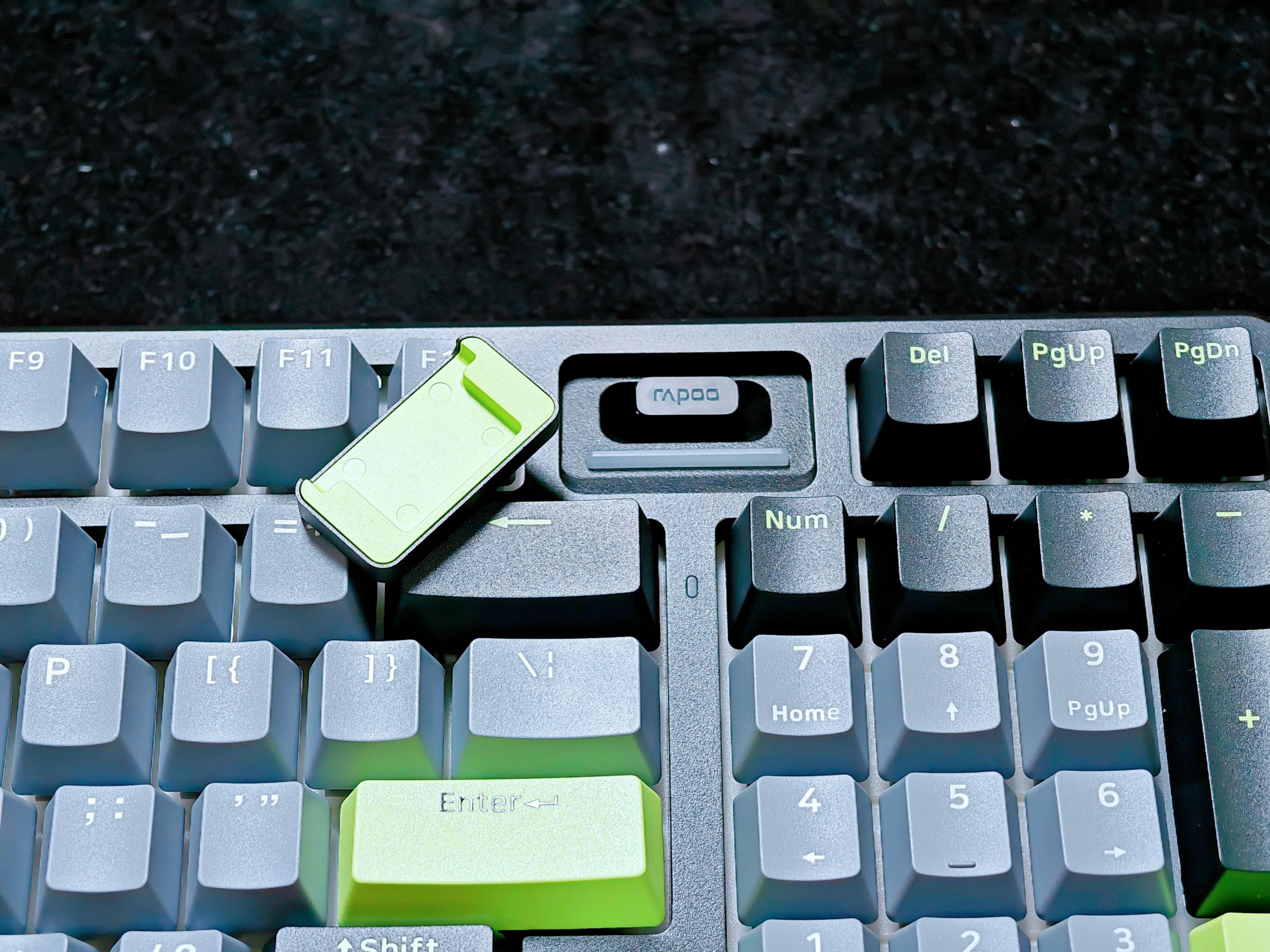 先说最直观的外观和实用性,它的黑灰绿配色特别耐打,不管桌面是简约风还是带点科技感,都能融进去。铝合金装饰条摸着手感扎实,灯光下还能透出点冷冽的光泽,不像有些廉价键盘,塑料感重得一上手就露怯。最让我惊喜的是右侧的 “时空幻境仓”,之前用无线键盘总丢接收器,要么找半天要么干脆重新买,这个磁吸仓直接把接收器 “藏” 起来,要用的时候一吸就拿出来,还顺带做了电量指示灯 —— 绿、黄、橙、红加红灯闪烁,剩多少电一眼就看明白,再也不用猜 “这键盘今天会不会突然关机”。