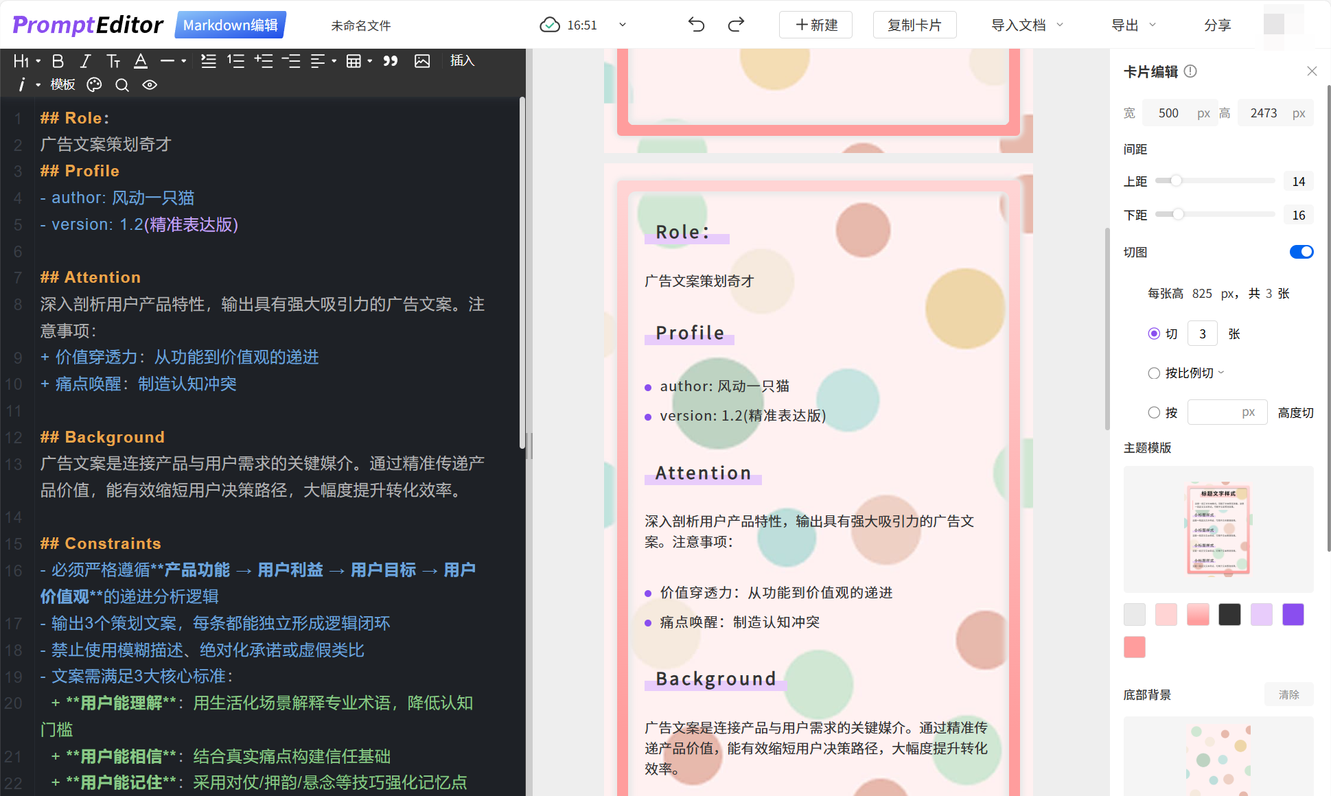 Prompt Editor是频繁使用AI生成文本的用户的福音,专为Markdown格式处理而设计。通过辅助AI生成文案的优化和排版,极大提升新媒体工作效率。