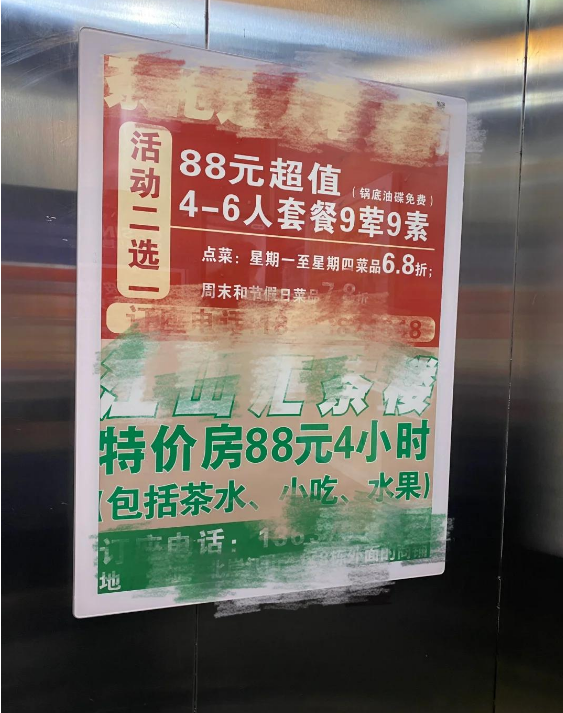 电梯、单元门贴满广告,装修、培训广告一张叠一张,撕了又贴。