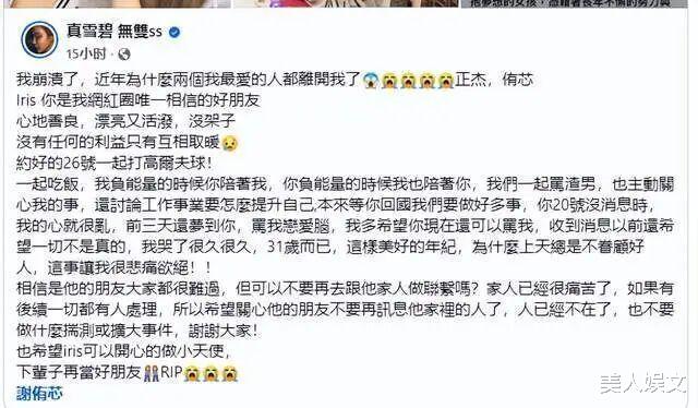 雪碧在文中称,谢侑芯是她在网红圈唯一的朋友,她心地善良、漂亮又活泼,毫无架子,两人之间没有任何利益纠葛,只有相互温暖和扶持 。她还透露,原本两人约好了 10 月 26 号一起去打高尔夫球,可没想到,这个约定竟成了永远无法实现的遗憾 。字里行间,满是对谢侑芯的不舍和怀念,让人看了为之动容。
