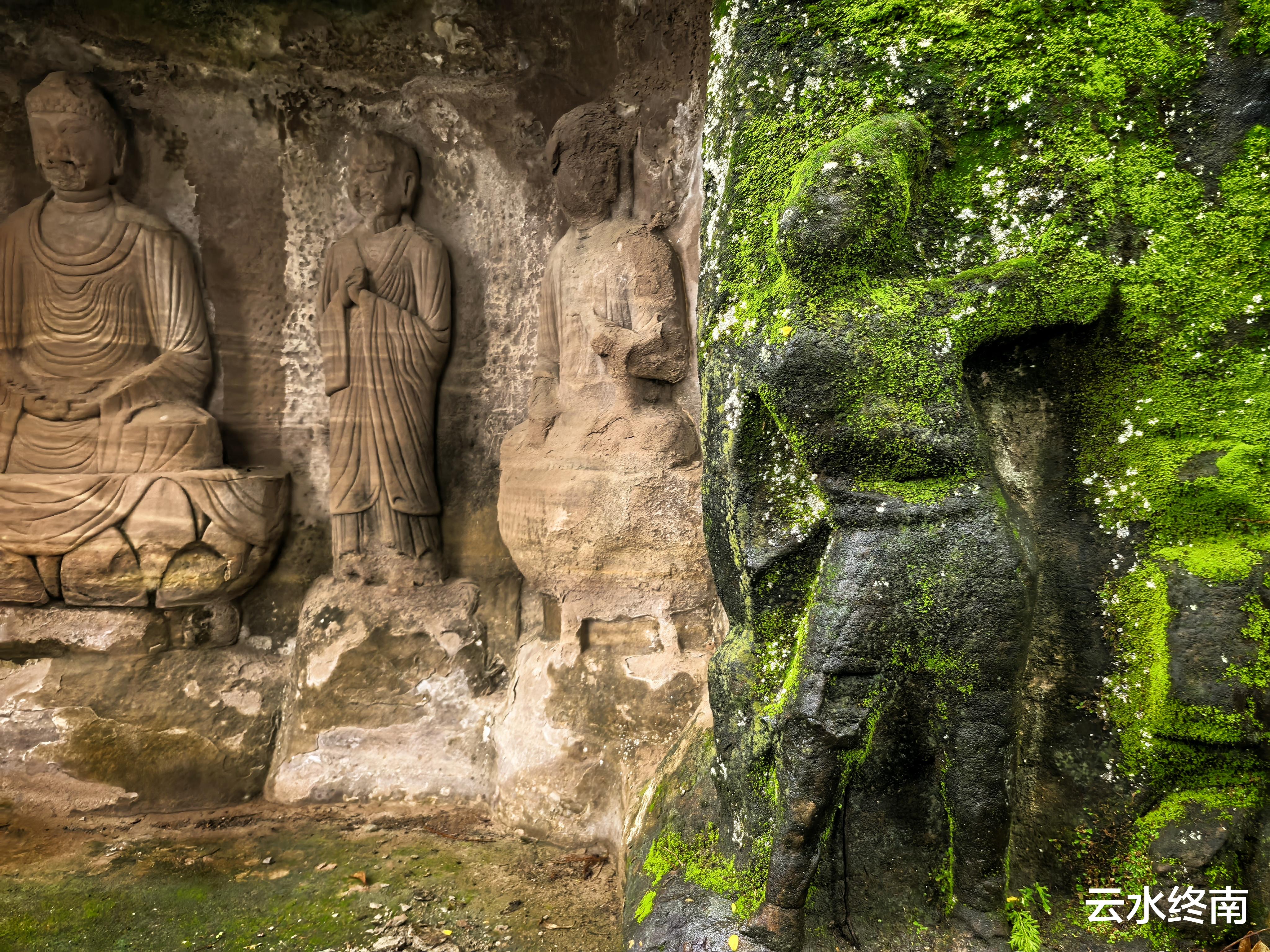 巴蜀地方多雨,外面裸露的石刻已经铺满了绿苔,但是凹进去的石窟里面确实很干爽。
