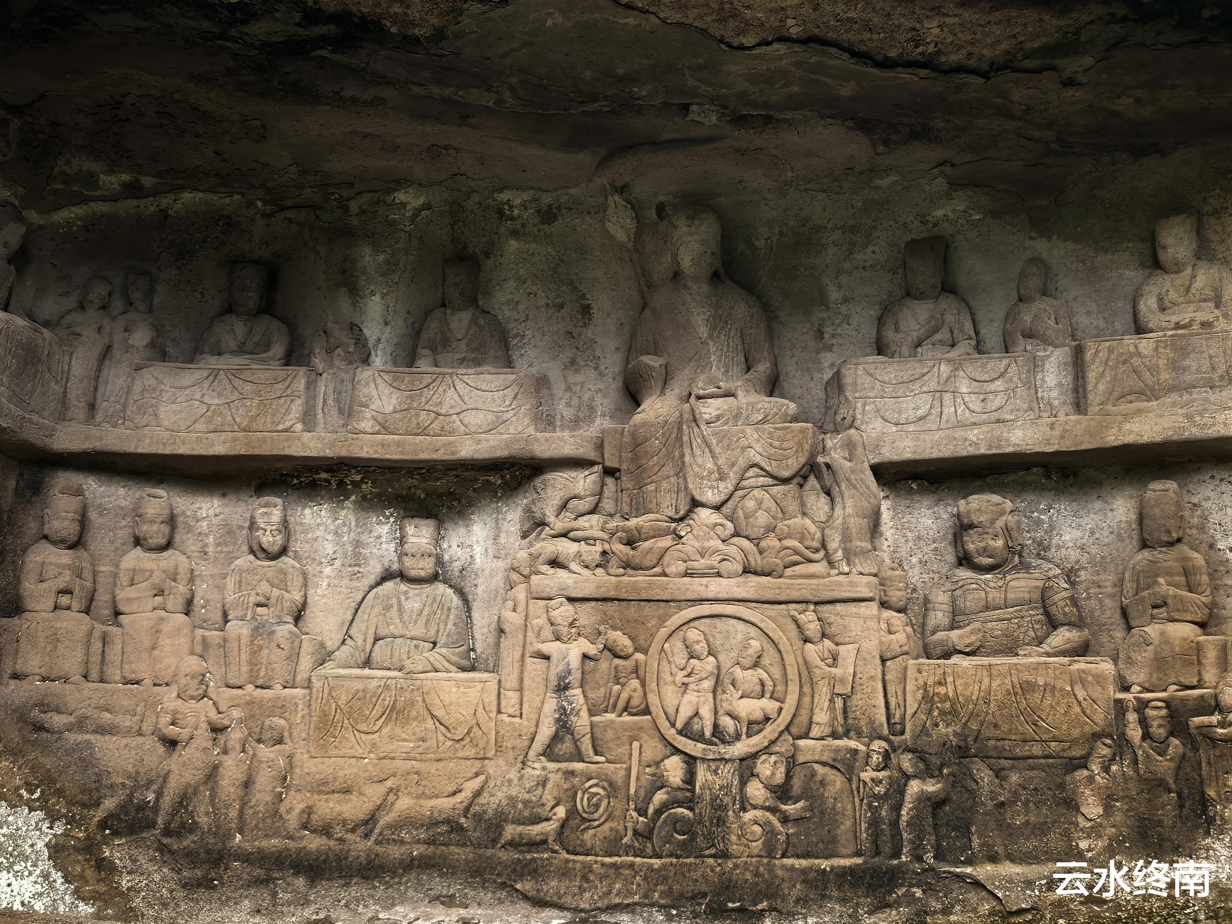 这个景区以圆觉洞命名,和大足石刻圆觉洞一样,这里面也没有灯光,洞中各佛菩萨雕刻的栩栩如生,个个庄严肃穆,一幅典型的教学场景。