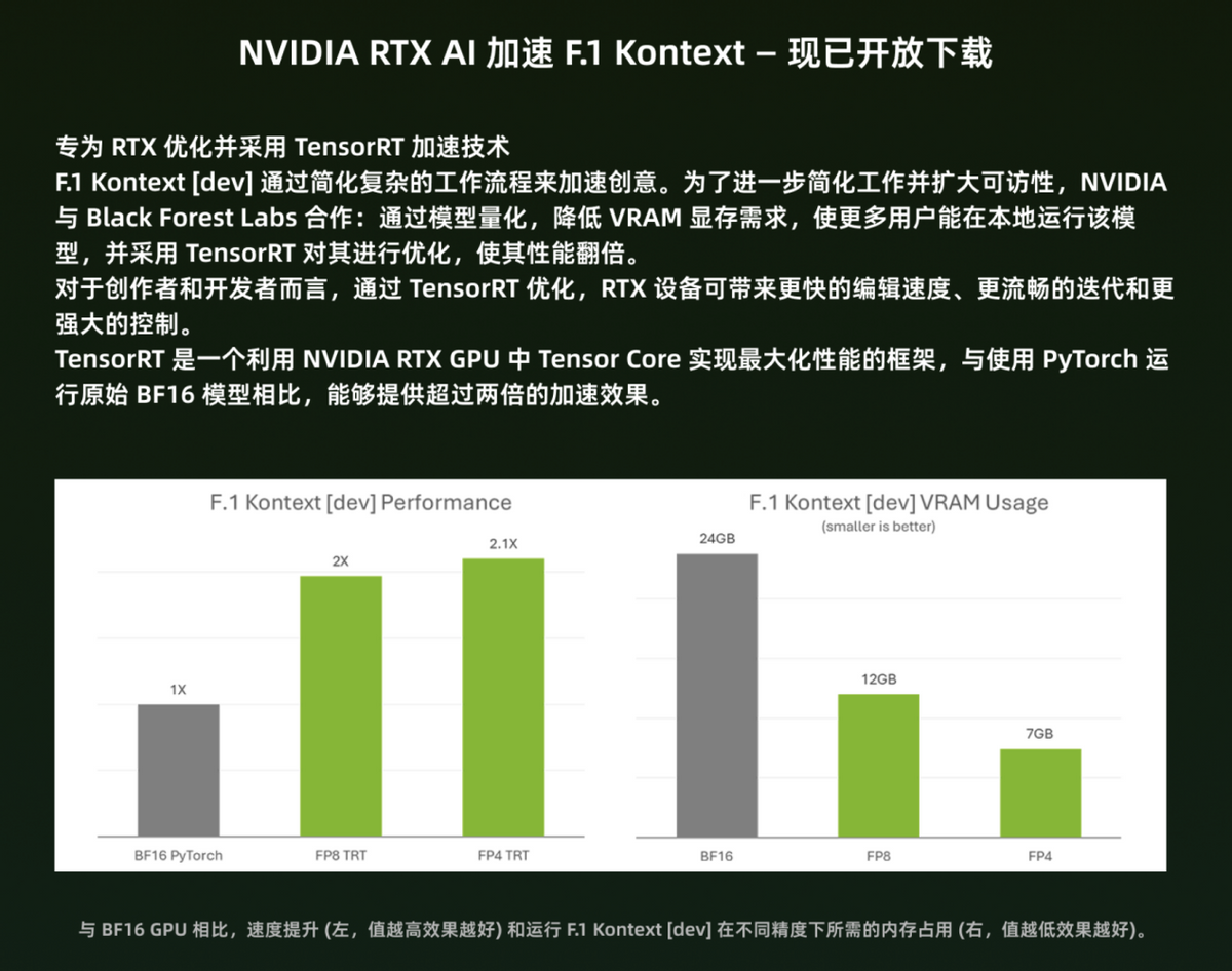NVIDIA RTX AI加速F.1 Kontext,现已开放下载!它专为RTX优化并采用TensorRT加速技术,通过简化复杂的工作流程来加速创意。为了进一步简化工作并扩大可访性,NVIDIA与Black Forest Labs合作:通过模型量化,降低VRAM显存需求,使更多用户能在本地运行该模型,并采用TensorRT对其进行优化,使其性能翻倍,为创作者和开发者带来更快的编辑速度、更流畅的迭代和更强大的控制。而TensorRT作为利用NVIDIA RTX GPU中Tensor Core实现最大化性能的框架,与使用PyTorch运行原始BF16模型相比,可提供超过两倍的加速效果。