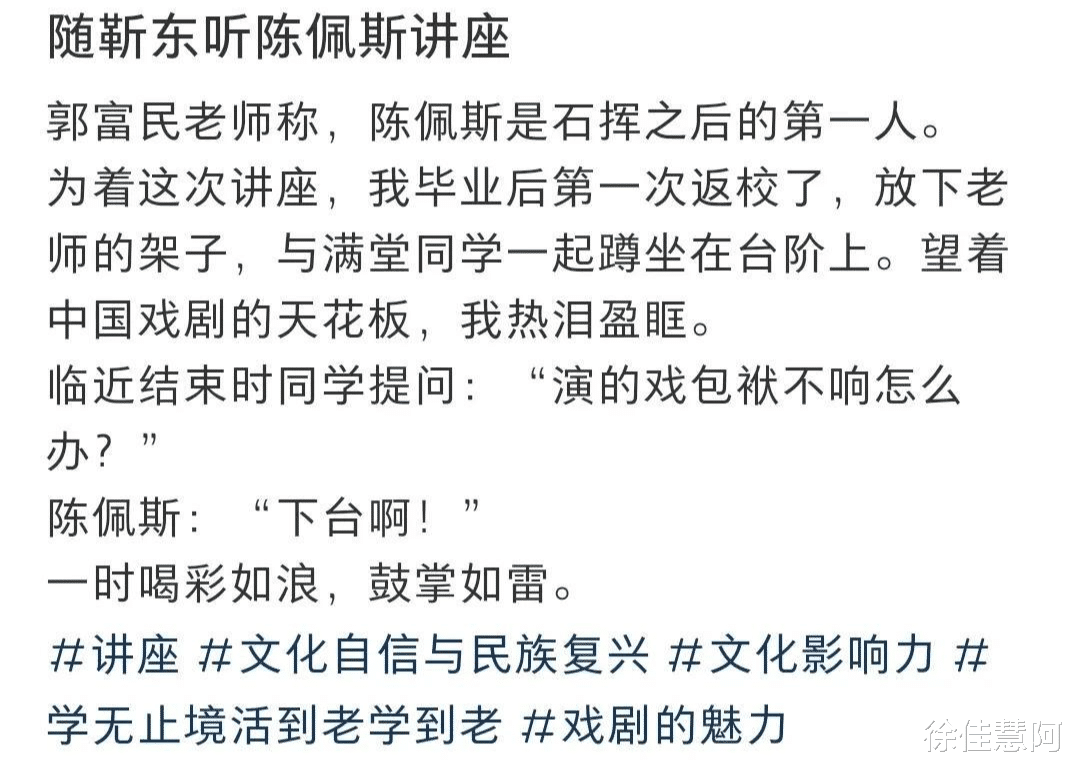 深秋的北京,中央戏剧学院的校园里弥漫着浓郁的艺术气息。一场特别的讲座在此举行,主角是著名喜剧表演艺术家陈佩斯和他带来的舞台剧《惊梦》。令人惊喜的是,著名演员靳东也低调现身,融入到这场艺术的盛宴之中。