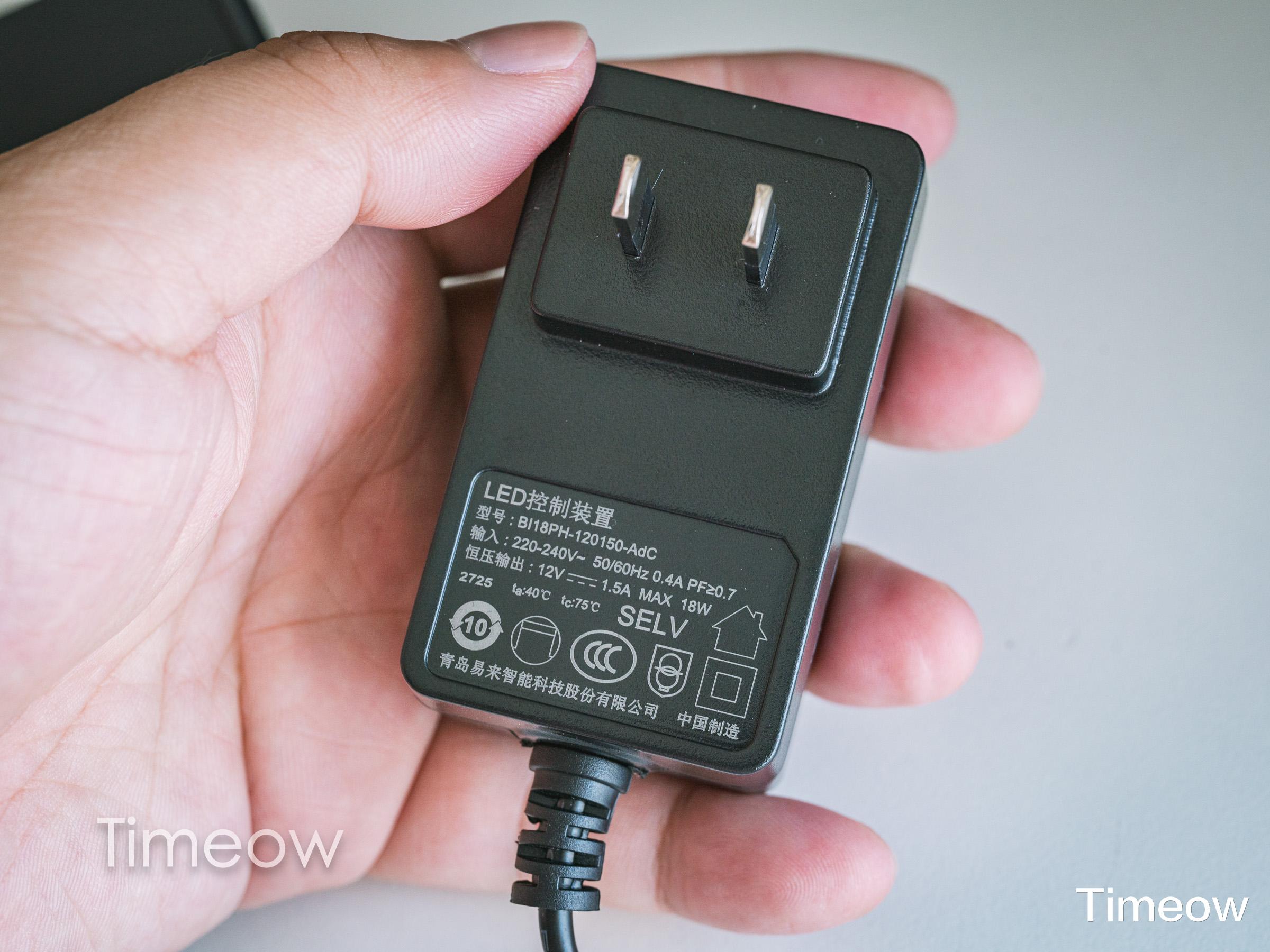 它的供电全靠这颗通过3C认证的18瓦电源适配器,品质不错。而且这个适配器内置了控制器,与电脑、挂灯相连后,可以通过米家app或“小爱同学”来对挂灯进行控制,玩法多多。
