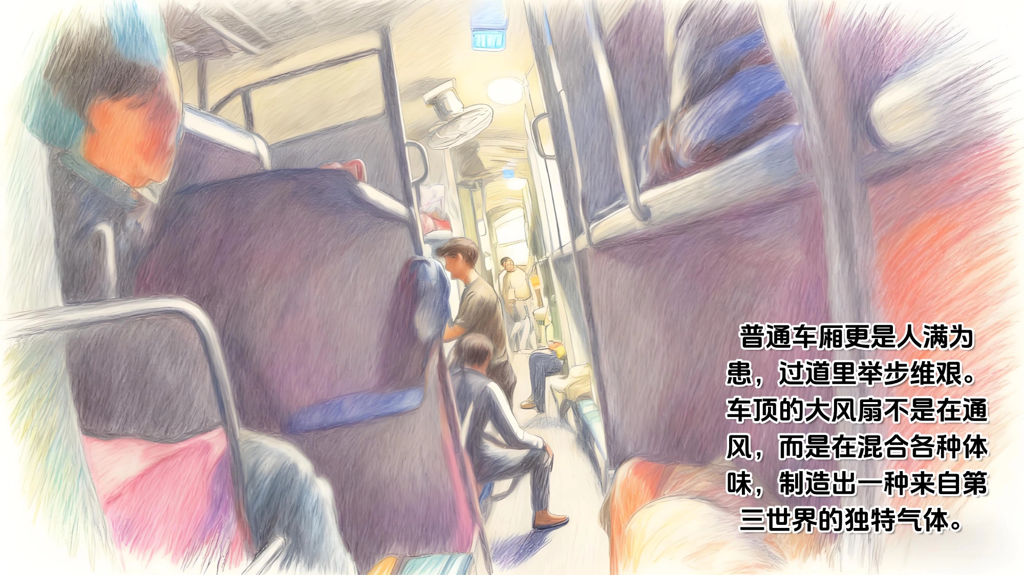 普通车厢更是人满为患,过道里举步维艰。车顶的大风扇不是在通风,而是在混合各种体味,制造出一种来自第三世界的独特气体。