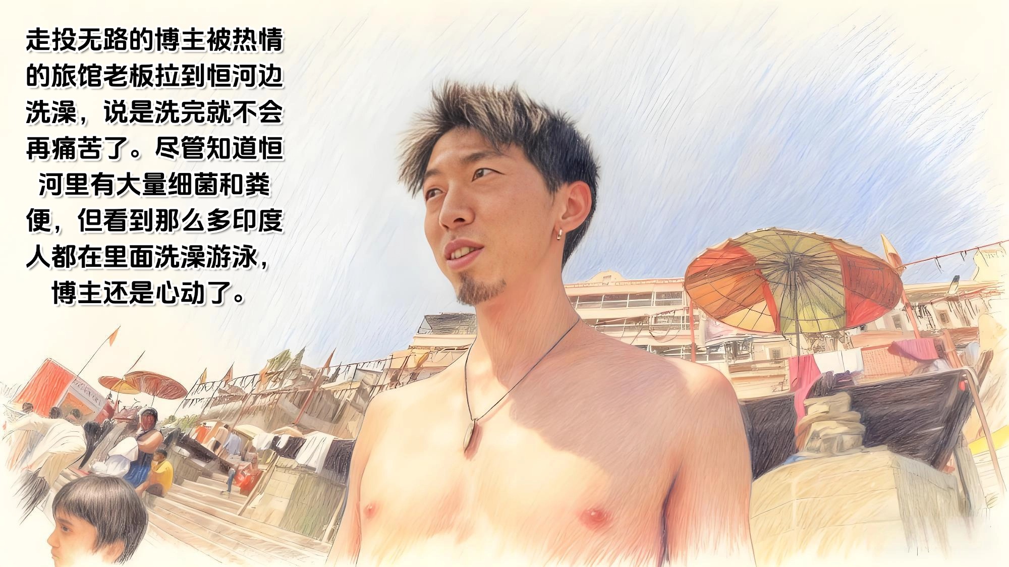 走投无路的博主被热情的旅馆老板拉到恒河边洗澡,说是洗完就不会再痛苦了。尽管知道恒河里有大量细菌和粪便,但看到那么多印度人都在里面洗澡游泳,博主还是心动了。