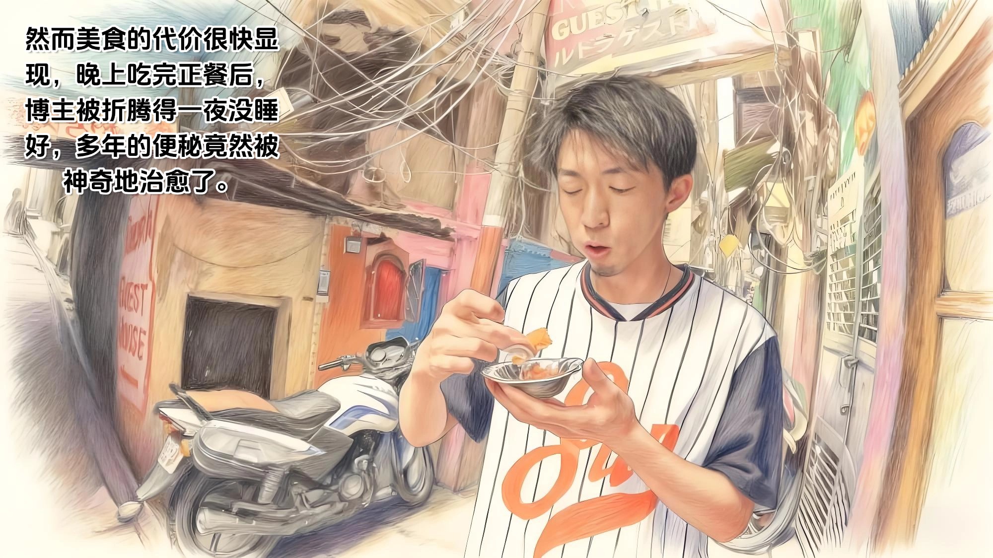 第二天,博主决定用美食来治愈自己。在热情本地人的带领下,他品尝了各种街头小吃。从油炸饼配咖喱,到"百年老店"的煎饼,再到橘色的甜品,每一样都让他印象深刻。