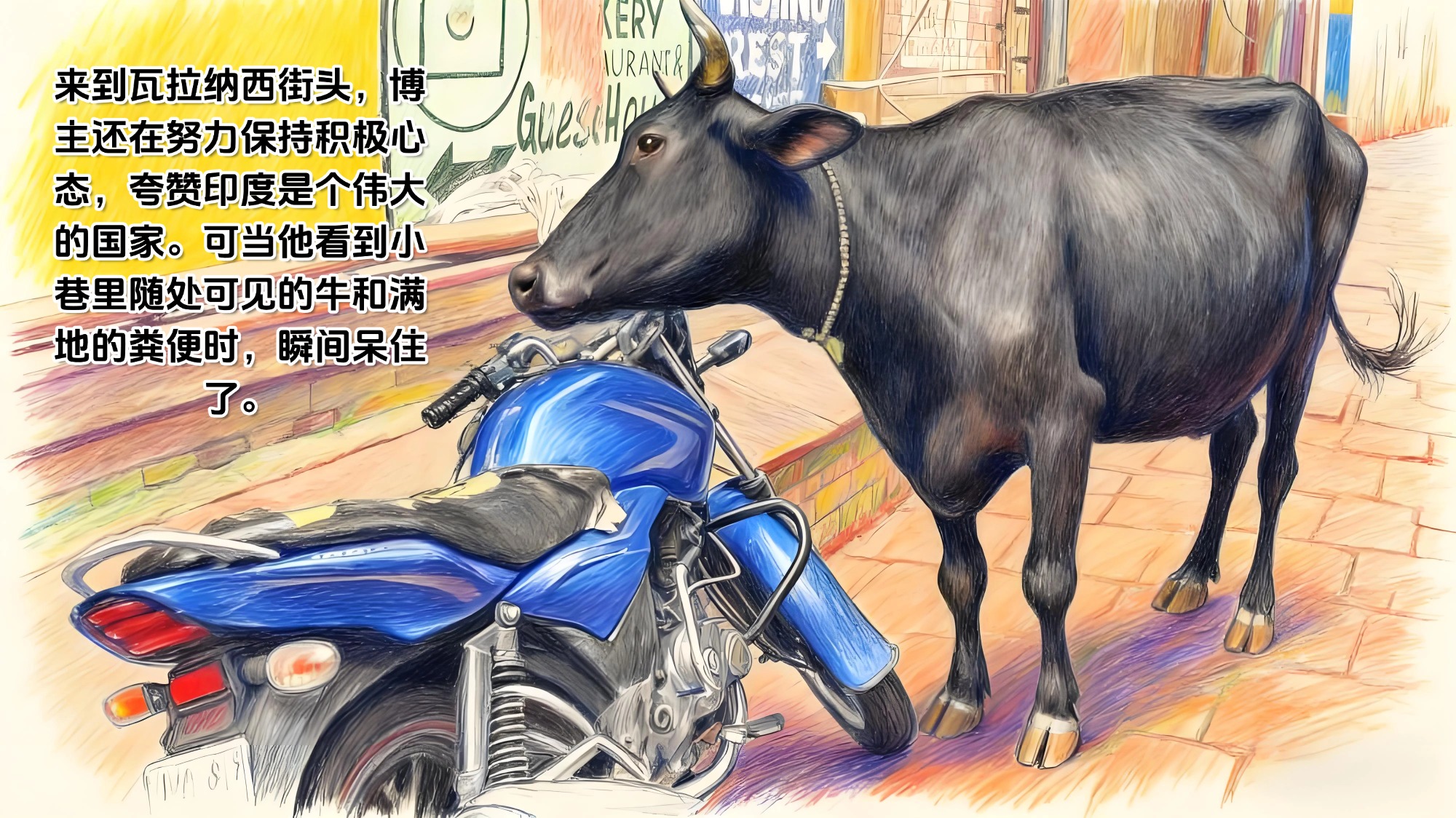 来到瓦拉纳西街头,博主还在努力保持积极心态,夸赞印度是个伟大的国家。可当他看到小巷里随处可见的牛和满地的粪便时,瞬间呆住了。