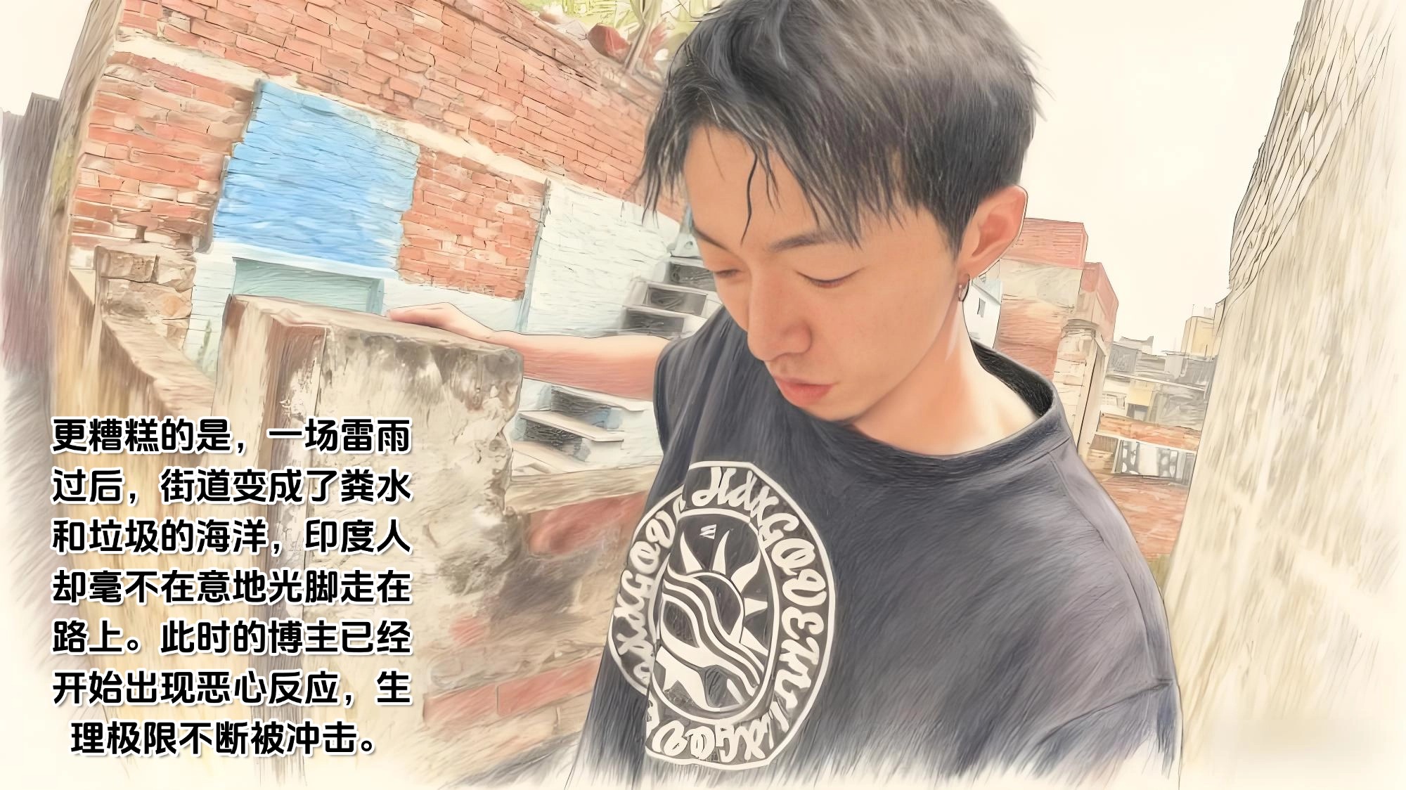 更糟糕的是,一场雷雨过后,街道变成了粪水和垃圾的海洋,印度人却毫不在意地光脚走在路上。此时的博主已经开始出现恶心反应,生理极限不断被冲击。