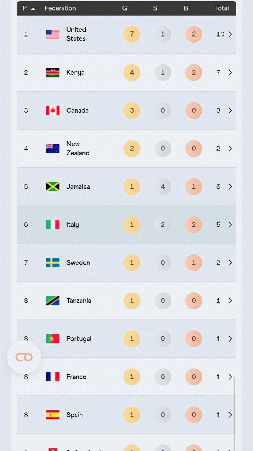 目前美国队依旧强势领跑,以7金10枚奖牌稳坐双榜第一。肯尼亚凭借女子3000米障碍破纪录夺冠,位居金牌榜第二。而中国队目前以1银2铜在第16名,不少网友看到排名后表示:“还是有点心疼,咱们什么时候能冲进前八?”“石雨豪这枚铜牌分量很重,他已经拼尽了全力!”