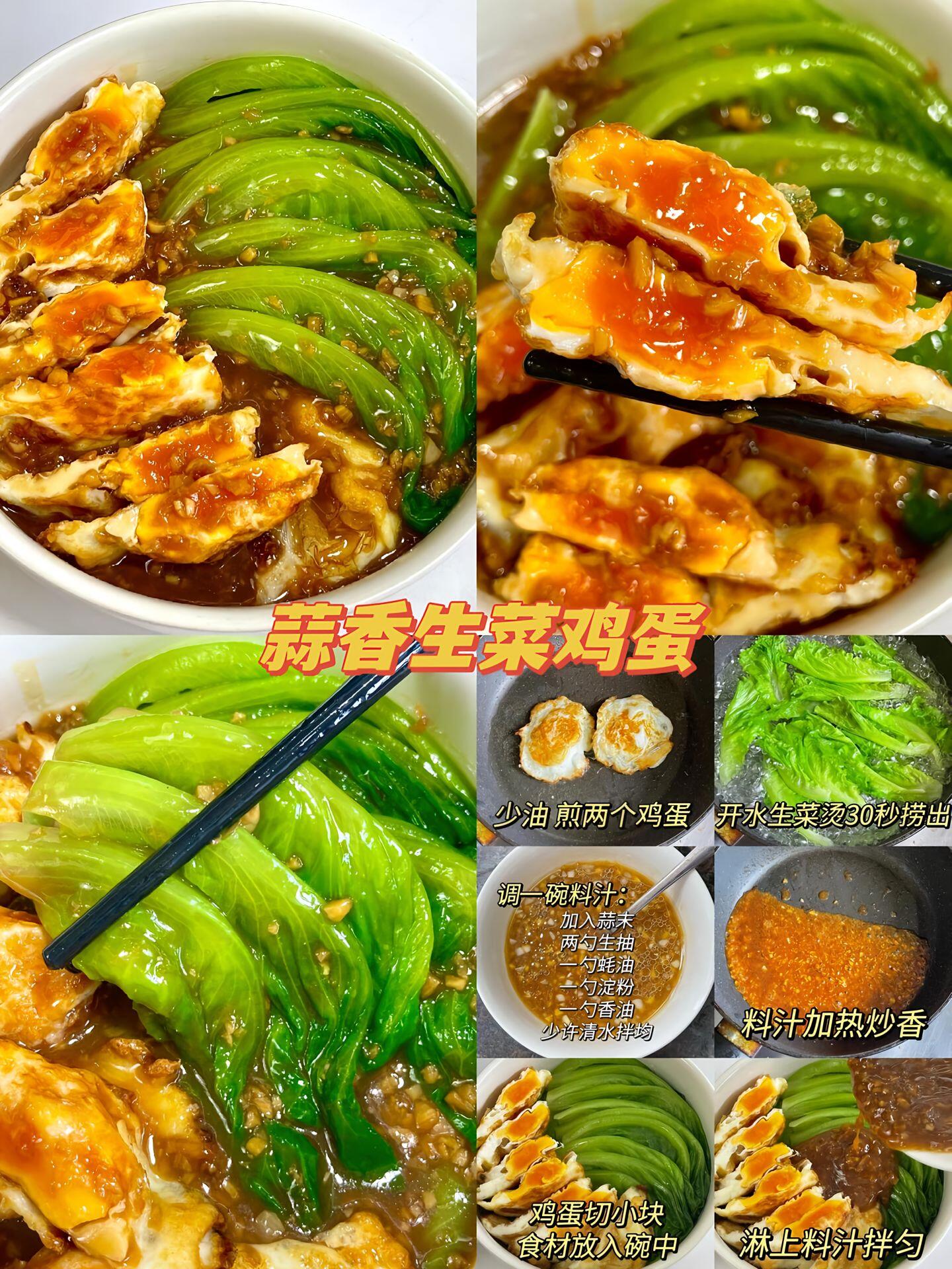 • 做法:少油煎两个鸡蛋,开水生菜烫30秒捞出;调一碗料汁:加入蒜末、两勺生抽、一勺蚝油、一勺淀粉、一勺香油、少许清水拌匀,料汁加热炒香;鸡蛋切小块,食材放入碗中,淋上料汁拌匀即可。
