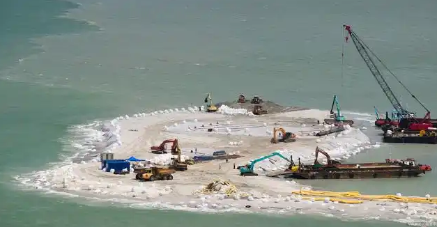 2013年春,南海永暑礁突然响起机械轰鸣。「天鲲号绞吸船以每小时4500立方米的速度喷沙造陆,相当于每分钟填满两个标准泳池。」 短短三年,七座"海上长城"拔地而起: