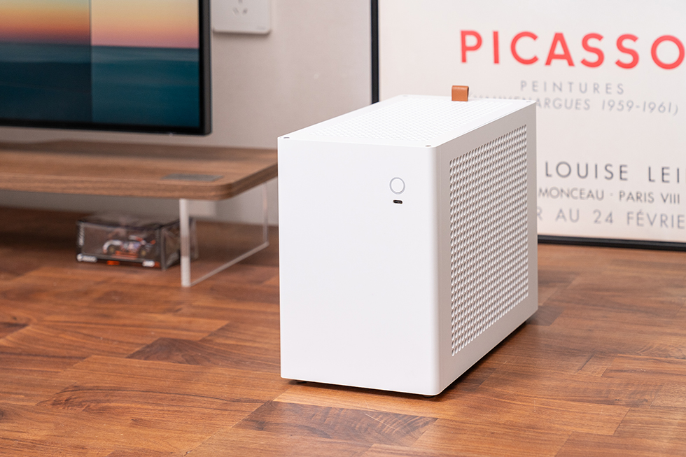 机箱前置 I/O 位于前面板右上角,上方为一个开关机键,外圈为白光 LED 电源指示灯,下方为 1 个全速 USB 3.1 Gen2 Type-C 接口。