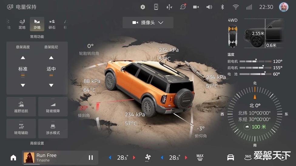 尽管福特智趣烈马被赋予了新能源身份,但福特烈马家族一贯的越野基因也没有忘记。福特智趣烈马配备前后电控、机械差速锁,而且全系标配四驱。哪怕是越野新手,在福特智趣烈马的越野360系统的辅助下,也能实时感知车身姿态,系统会提前预警俯仰/侧倾角风险,给安全加了一道智能保障。更有趣的是,福特智趣烈马内置智能旅行路书功能,支持3D卫星地图导航和沿途兴趣点智能推荐,并可联动车身摄像头和传感器,随时记录分享每一段探索历程。