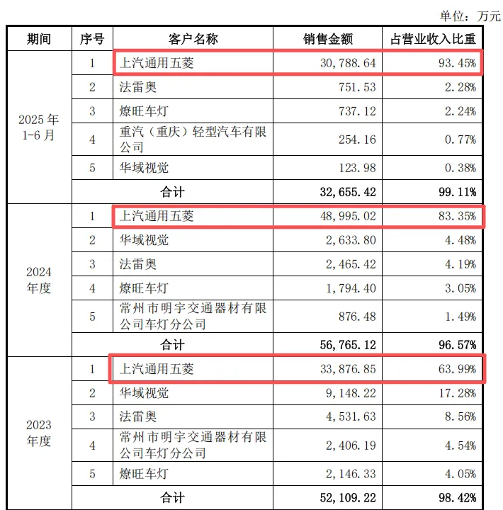 在汽车零部件行业激烈的竞争格局中,通宝光电的客户结构呈现出一个突出的特征,其高度集中的依赖性引发了市场对其经营风险的关注。2022年至2025年上半年,通宝光电对前五大客户的销售收入占营业收入的比例分别高达94.65%、98.42%、96.57%和99.11%,其中,第一大客户上汽通用五菱占比分别为66.83%、63.99%、83.35%和 93.45%,2024年,公司超过八成收入来源都系于单一客户。