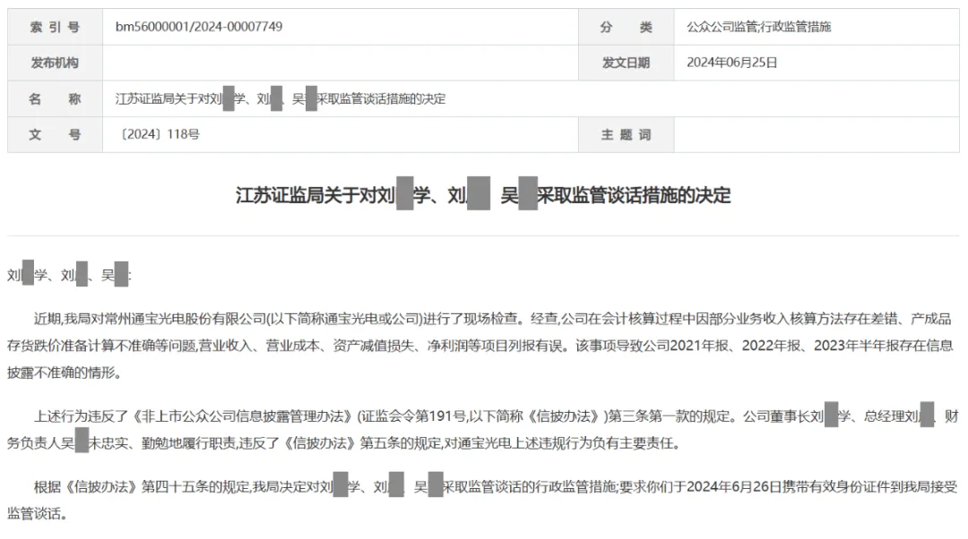 与此同时,通宝光电的董事长刘某学、总经理刘某以及财务负责人吴某,作为公司运营和财务管理的核心决策与执行人员,未能依照规定忠实、勤勉地履行职责,对通宝光电的信息披露不准确问题负有主要责任。因此,江苏证监局同样对上述三人采取了监管谈话的行政监管措施,并要求他们于2024年6月26日携带有效身份证件到该局接受监管谈话。