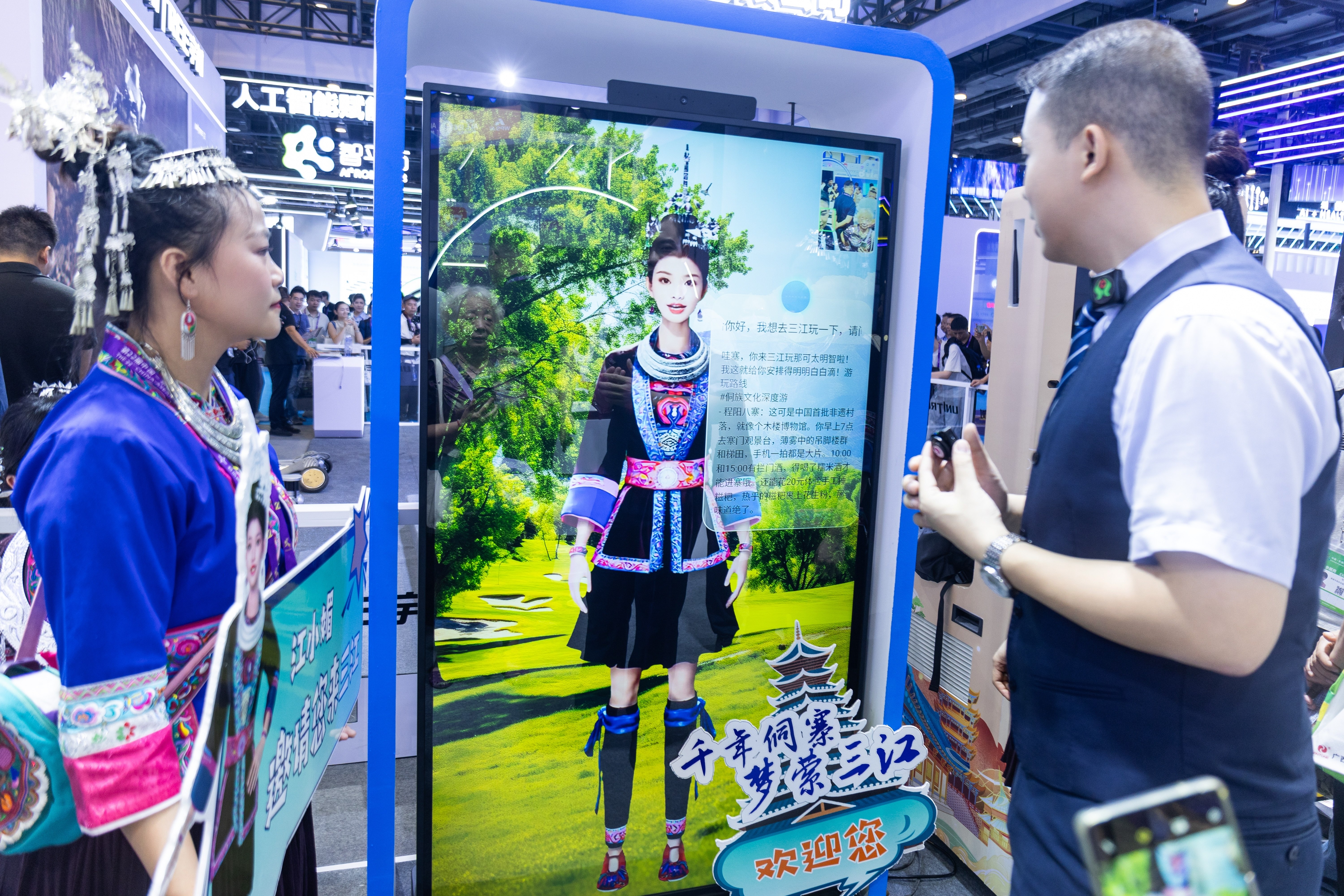 据悉,“江小媚”形象灵感源于侗族创世神话,是集成了语音识别、自然语言处理、计算机视觉等先进AI技术的数字人。她不仅能够流畅使用中英双语,还支持六大东盟国家语言实时交互,为现场观众解答有关三江侗族自治县文化、旅游等方面的疑问,提供沉浸式、智能化的观展体验。