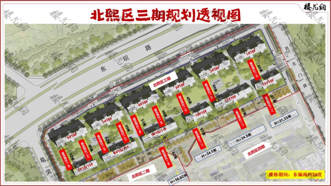 由于楼栋东偏南约28度,导致三期的楼间距比远超最低指标。