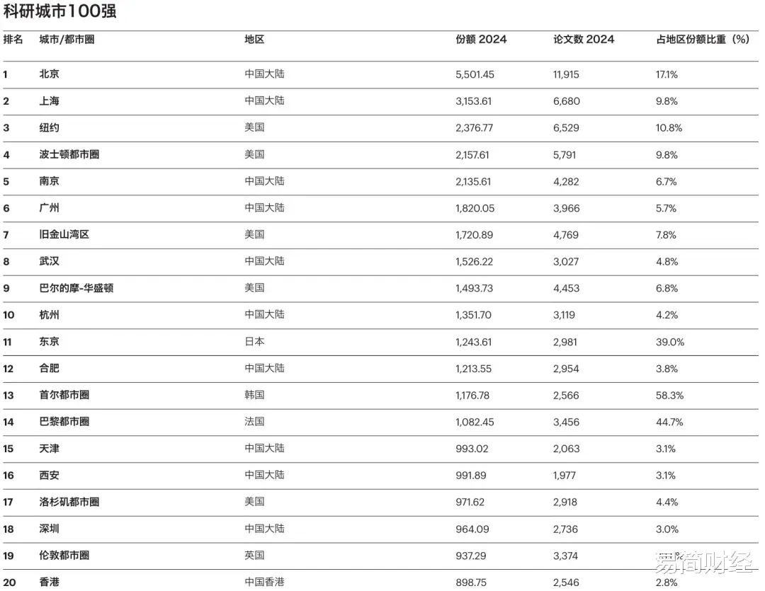 上海以3153.61的份额排名全球第二,论文数为6680,占比9.8%;