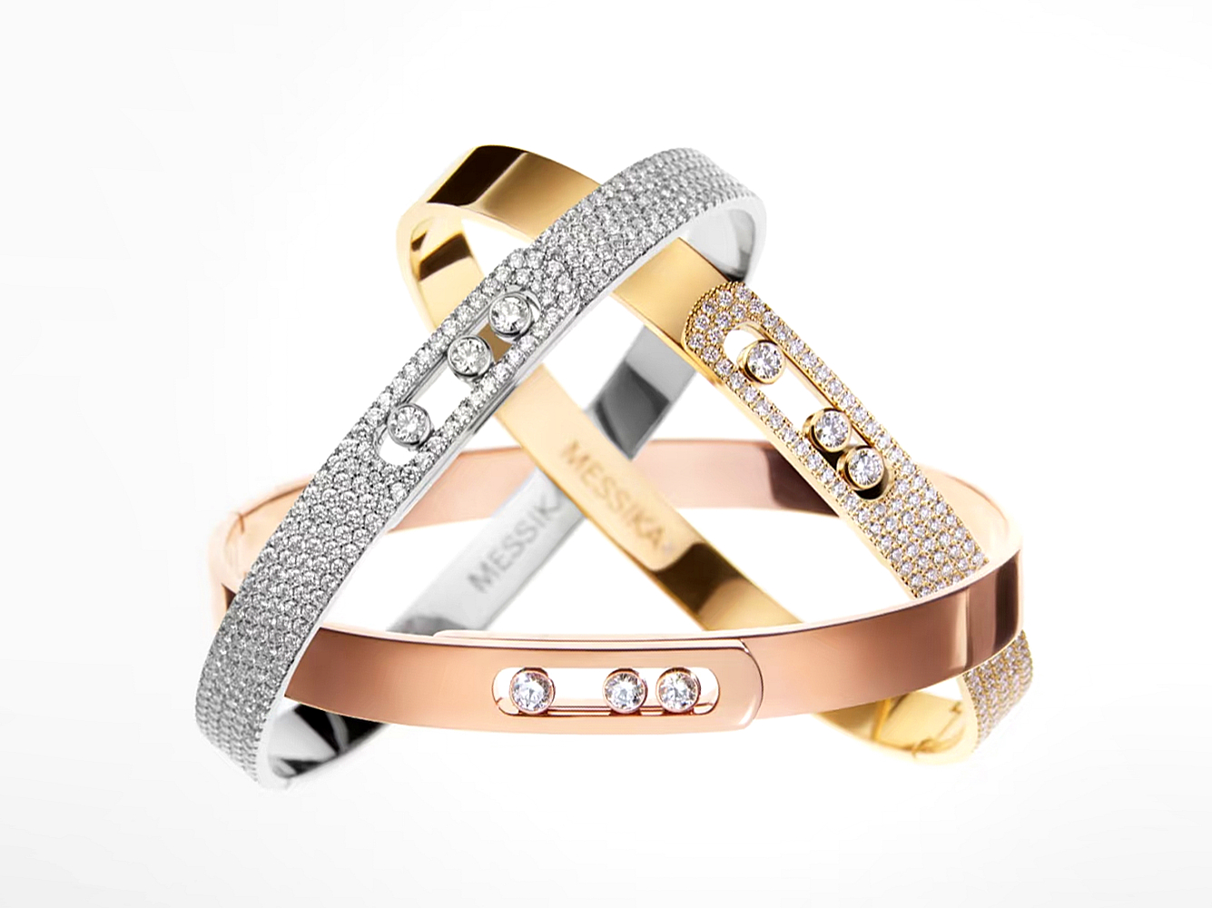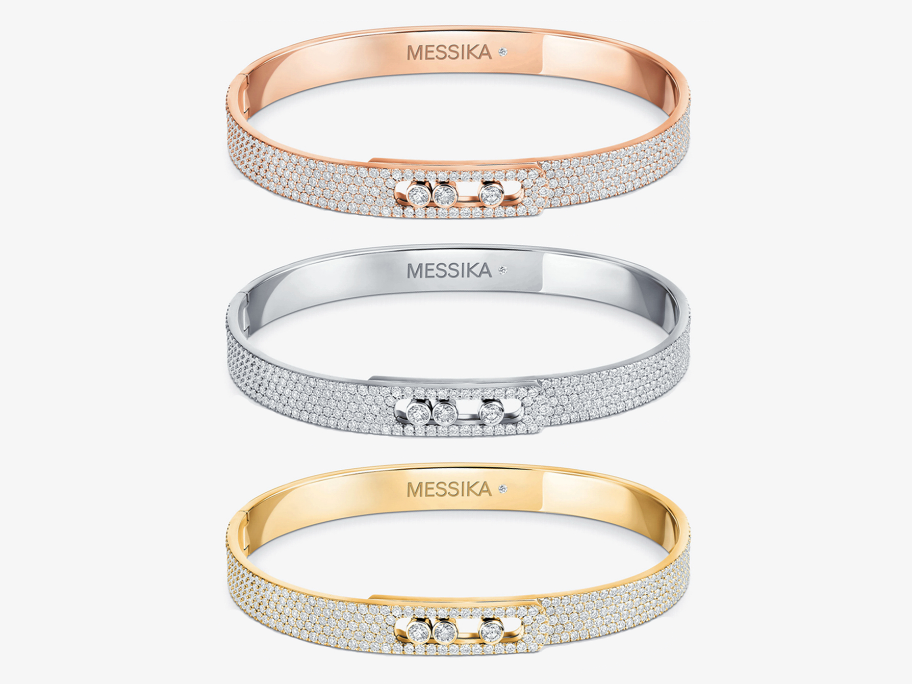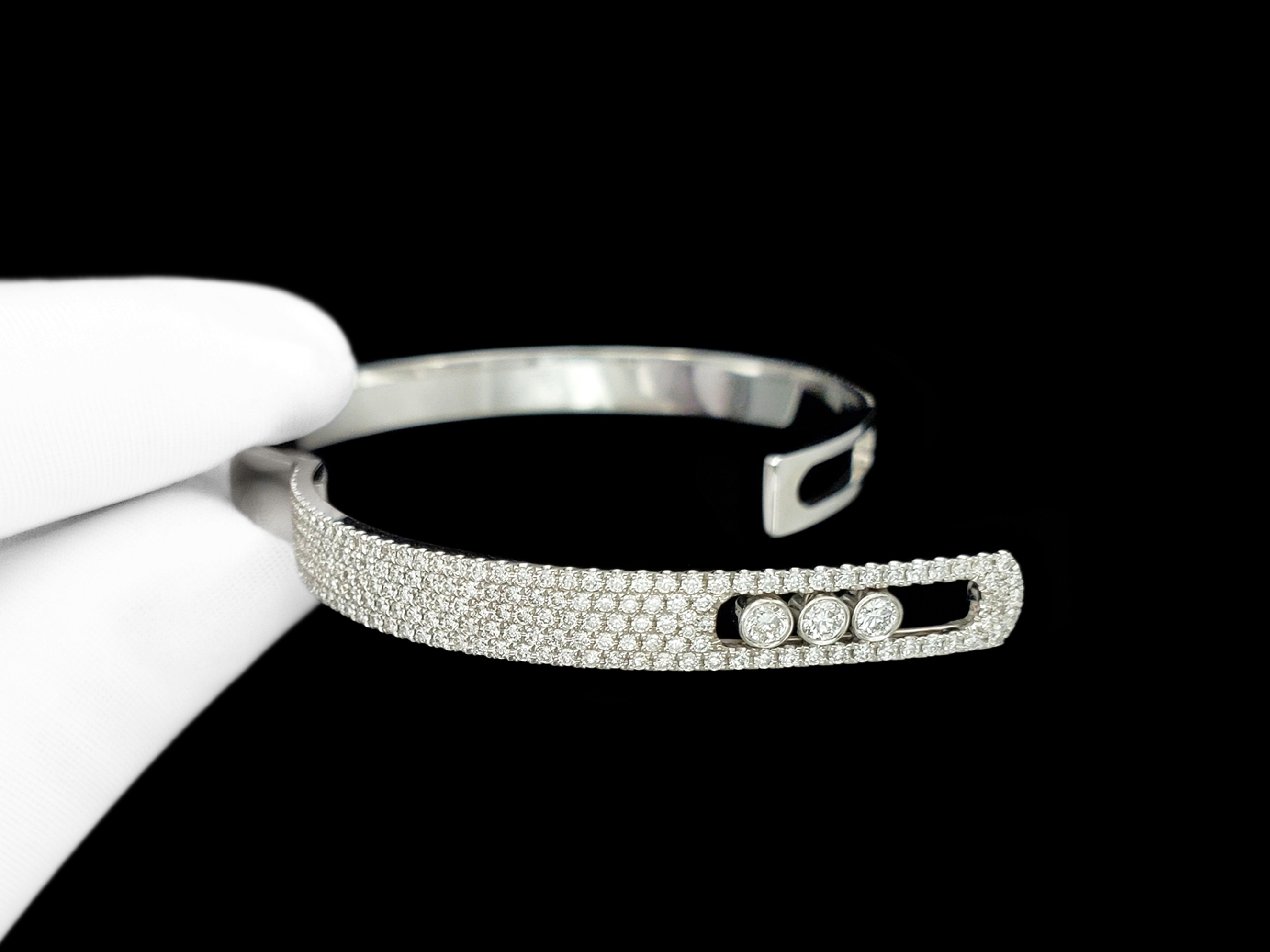 手镯最大的亮点当属主位上移动的钻石,这也是贯穿梅西卡所有珠宝的标志性设计。三颗钻石直径均为2.3毫米,对应5分规格,每一颗都经过包边处理,并嵌入进创新的导轨系统,钻石由此会在举手投足间来回跳跃。这三颗钻石代表了爱情里的过去、现在和未来,仿佛演绎了一场跨越一生一世的时光之旅。
