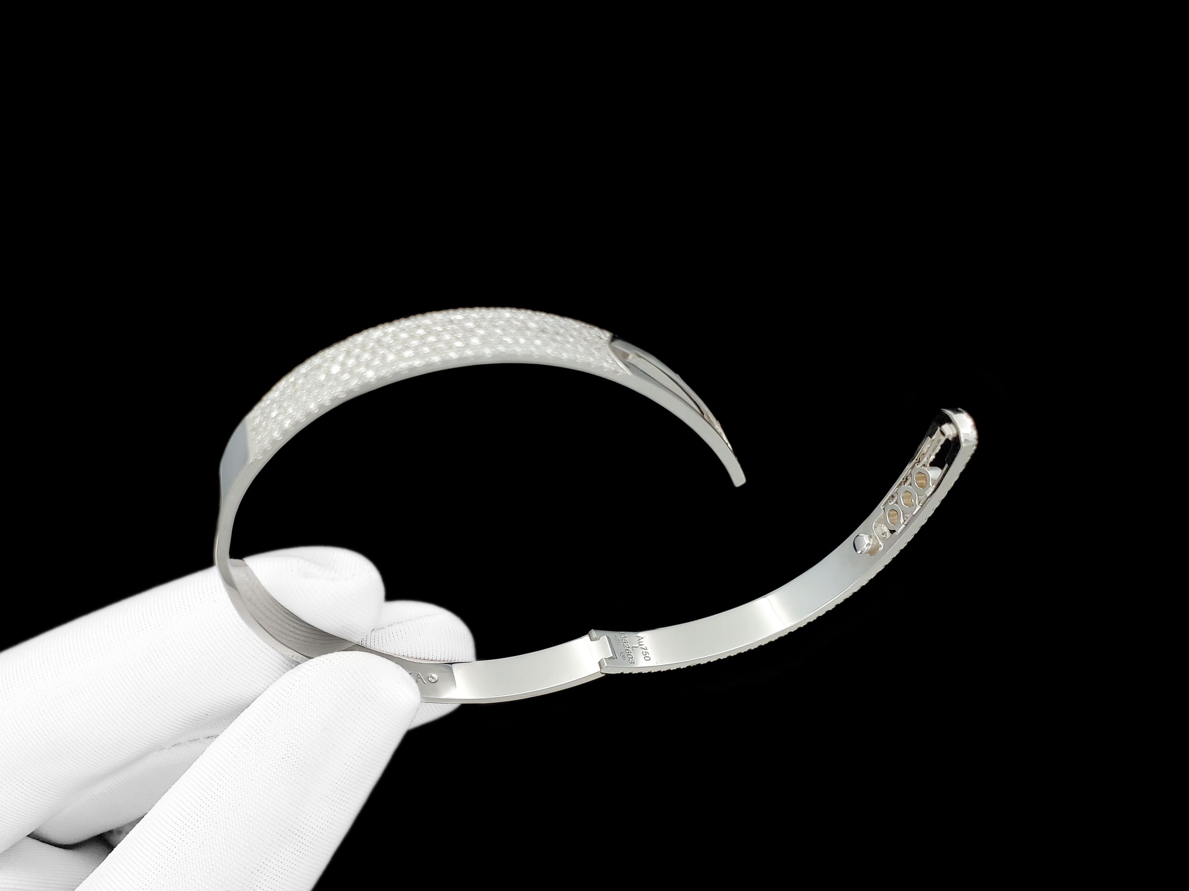 如果您看到珠宝实物,相信您一定会被那耀眼的火彩所深深吸引。手镯周身采用了极为考究的全密镶工艺,数以百计的精致美钻如同星河般散落在镯体的每一寸表面。其中,钻石共分成五排,排与排之间采用交错式布局,在平滑的曲面创造出强烈的层次感和律动感。这些钻石大都甄选1.15毫米直径、0.6分大小的碎钻。体量虽小,但通过繁复而又精密的镶嵌,让一片片绚丽的光斑不断摇曳,使得手镯在任何角度都会迸发出层层叠叠的流光溢彩,尽显佩戴者卓尔不凡的高雅气质。