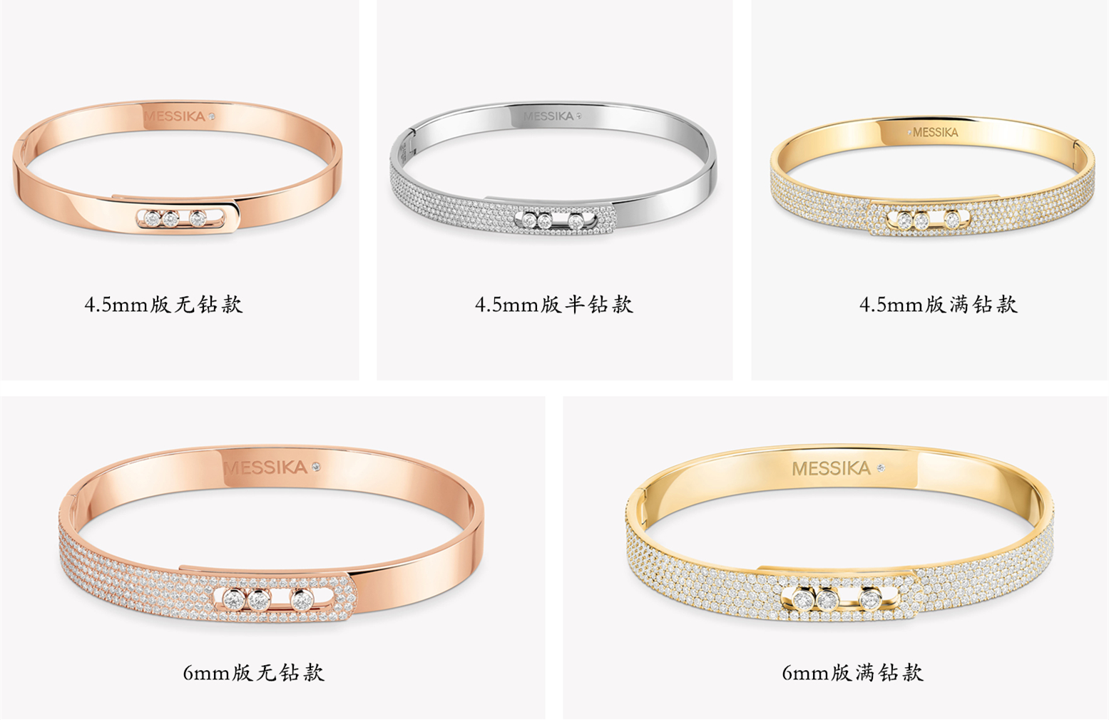 其中,小号款凭借适宜的尺寸和亲民的价格,相对热卖一些,按照K金材质和镶钻配置,专柜共有推出9种样式;至于6毫米规格的手镯,除了满钻与半钻款式外,专柜近年来还上架了带有拉丝纹工艺的新品,细腻的金属光泽与排钻的璀璨光芒交相辉映,更显高级质感。至于更大尺寸的手镯,由于较为少见,在此便不做详解。