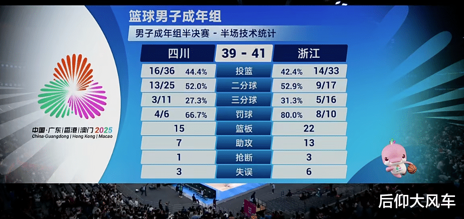 节中阶段余嘉豪顶着3犯回来再直面周琦,王博顺势再上双塔,王奕博转换再得2分,但浙江依旧没法顶住四川的内线冲击,只能赔上犯规,但也以消耗了四川双塔,上半场打完,四川队没能像上一轮碾压北京那样靠双塔建立大比分领先,反而半场以39-41落后,有点不可思议。