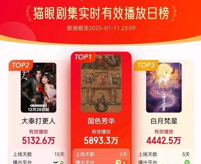 可以看到的是,《国色芳华》有效播放已经是连续多天拿下第一,力压《大奉打更人》和《白月梵星》,其中,更是与《白月梵星》拉开了超一千万的差距。