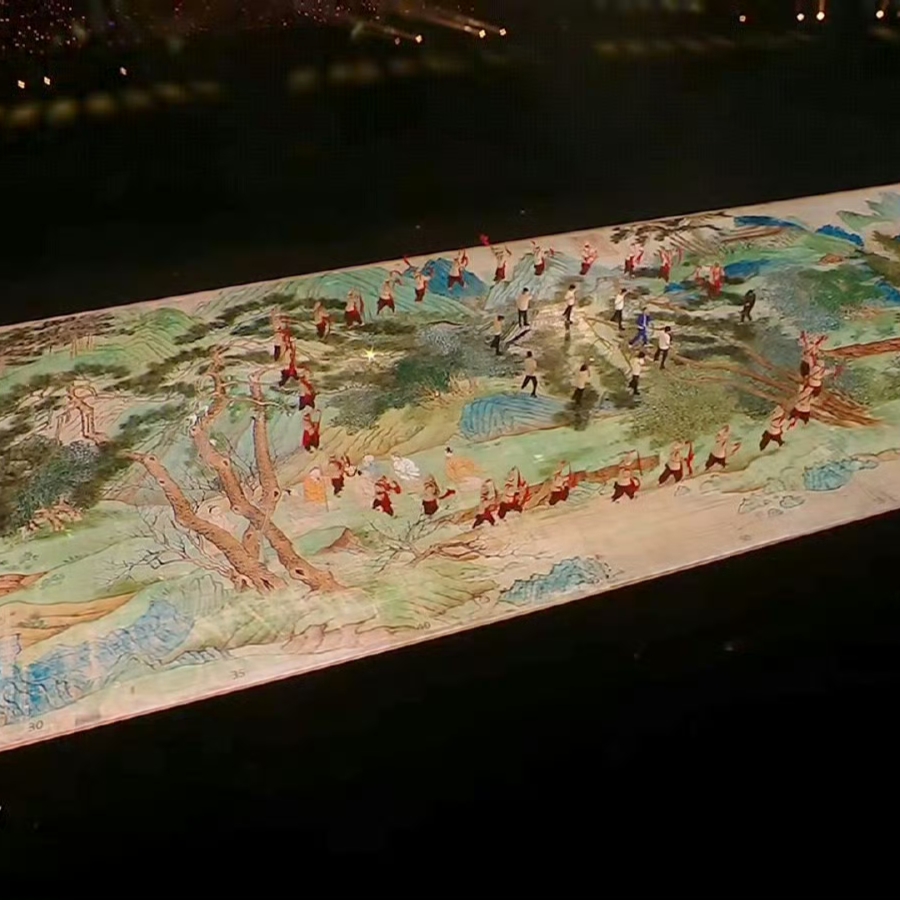 演出经过精心铺陈的四个篇章,逐渐推向高潮。开场时,张艺兴头戴长翎冠帽从升降台现身,肩部金龙在激光下熠熠生辉,一曲改编版《莲》瞬间点燃全场。而真正引爆社交网络的,是第二篇章的“画中游”场景:2200平方米的巨型地屏上,《千里江山图》的山水随音乐流动,当张艺兴以手势操控画卷开合时,一台青花瓷涂装的拖拉机破画而出,这种荒诞又震撼的混搭令现场惊呼不断。更令人拍案的是非遗方阵的登场——陕北说书人用方言演绎电子乐,侗族歌队与街舞团共跳赛博朋克式的祭祀舞蹈,甚至京剧《闹天宫》的武生从威亚俯冲而下,与投影中的天兵天将虚实交锋。这种打破时空界限的编排,让观众恍惚间仿佛同时置身于盛唐集市与未来战场。