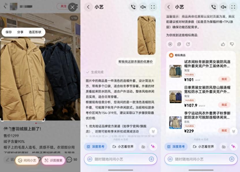 先说“精明购物”。以前看到一件喜欢的商品,总要复制名称,再打开好几个App来回搜索比价,非常繁琐。现在有小艺就简单多了,它支持指关节圈选识别功能,我只需要用指关节在屏幕上画个圈,圈中商品,再点击“问问小艺”,选择“找同款”,系统就能立刻识别商品,找到全网优惠价格,省时又省心。