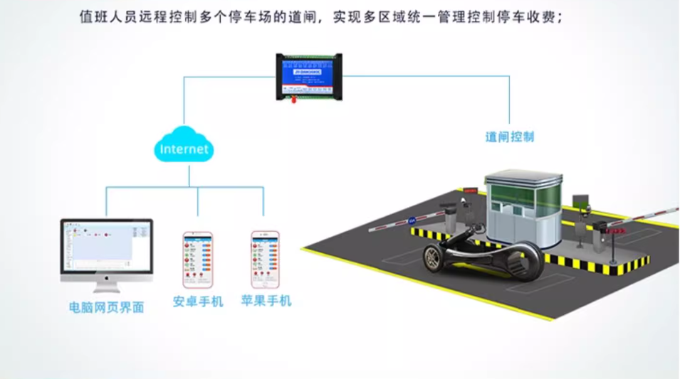 - 智慧停车场中,通过转换器连接RS485道闸、LoRa车位探测器,实现车位状态实时显示与城市交通云平台的对接。