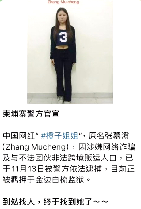 网红“橙子姐姐”终于被找到了。据《柬中时报》证实,“橙子姐姐”(原名张慕澄),因涉嫌网络诈骗及与不法团伙非法跨境贩运人口,已于11月13日被警方依法逮捕。要知道,这个时间正好与“橙子姐姐”此前失联的时间对上了。