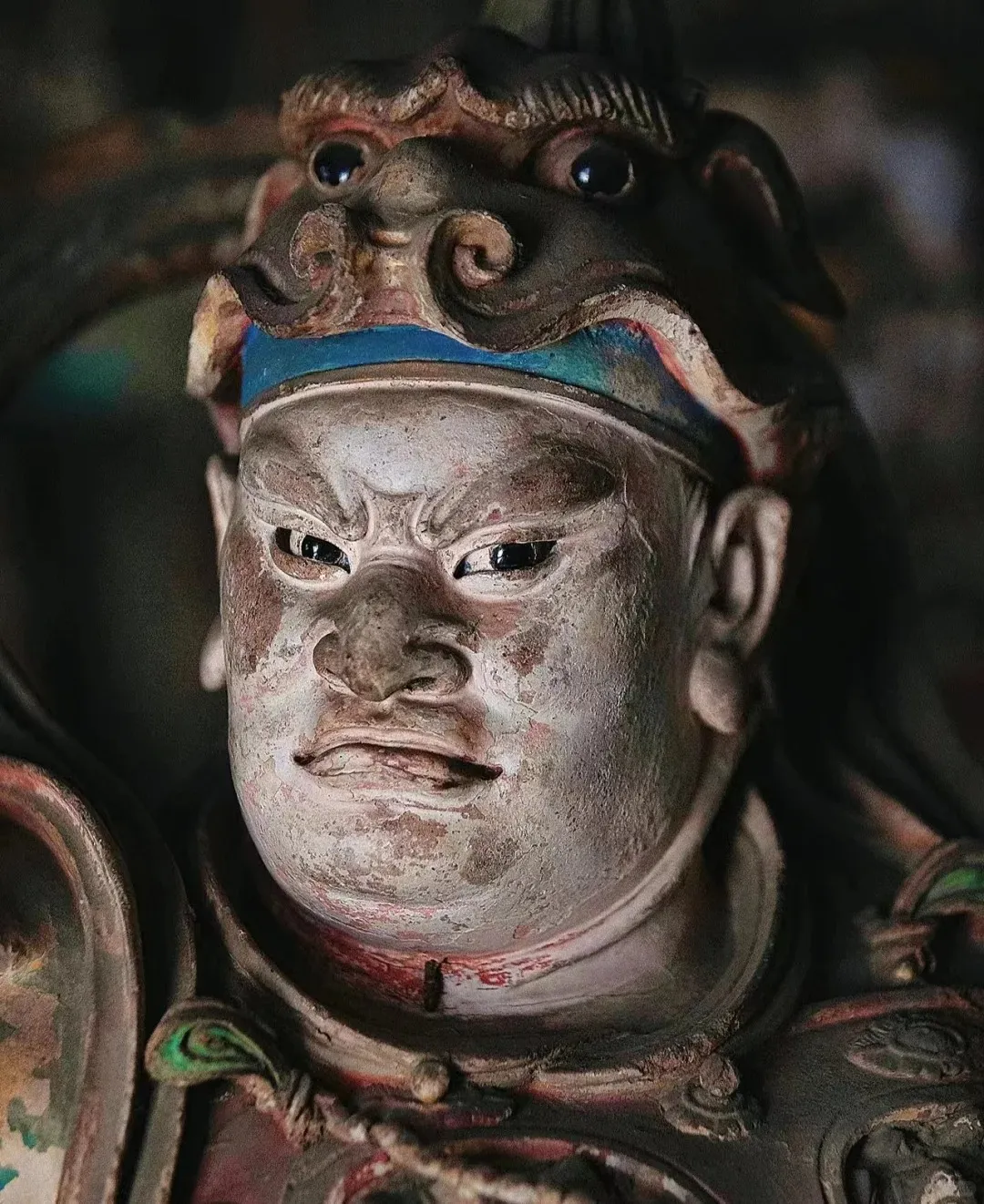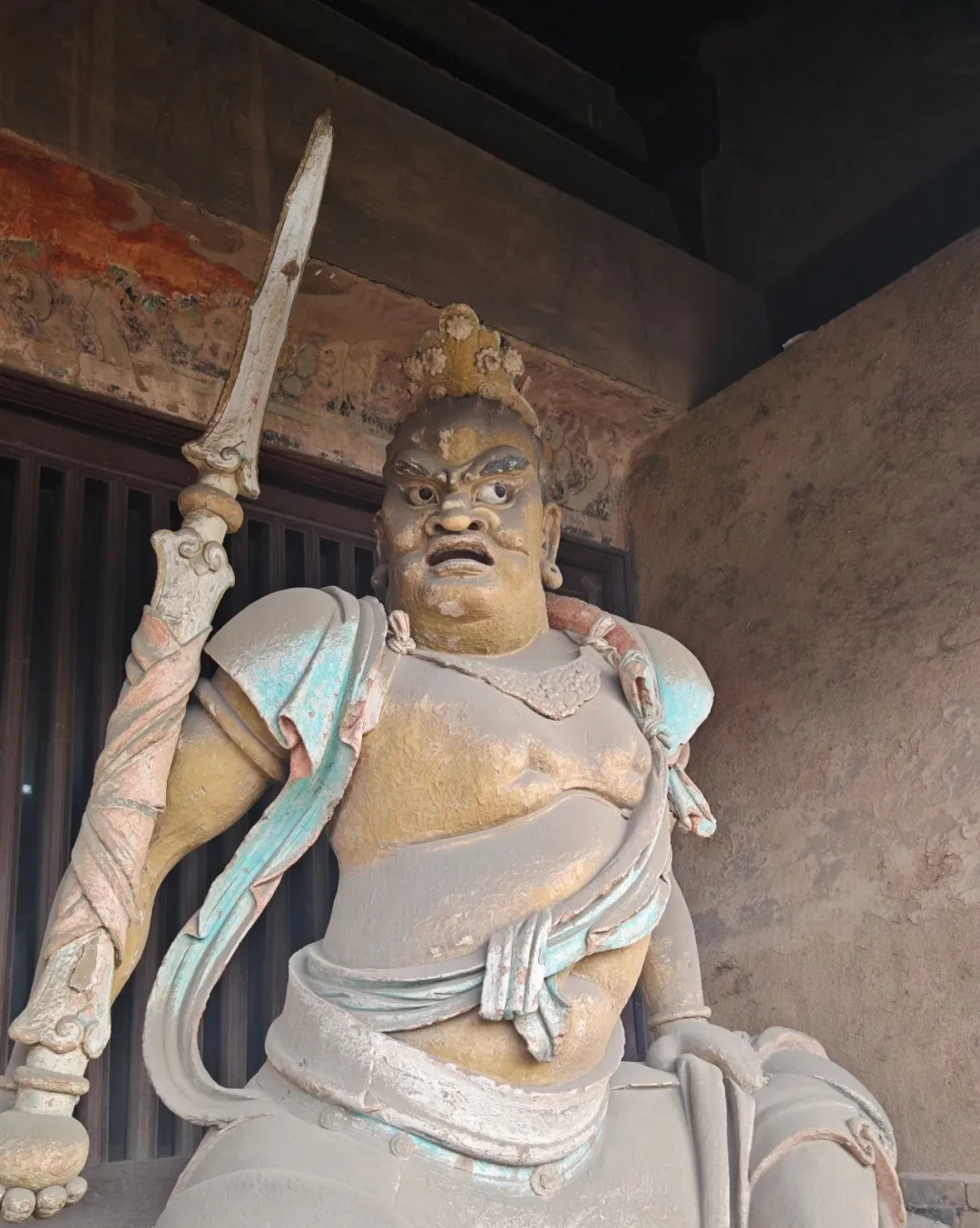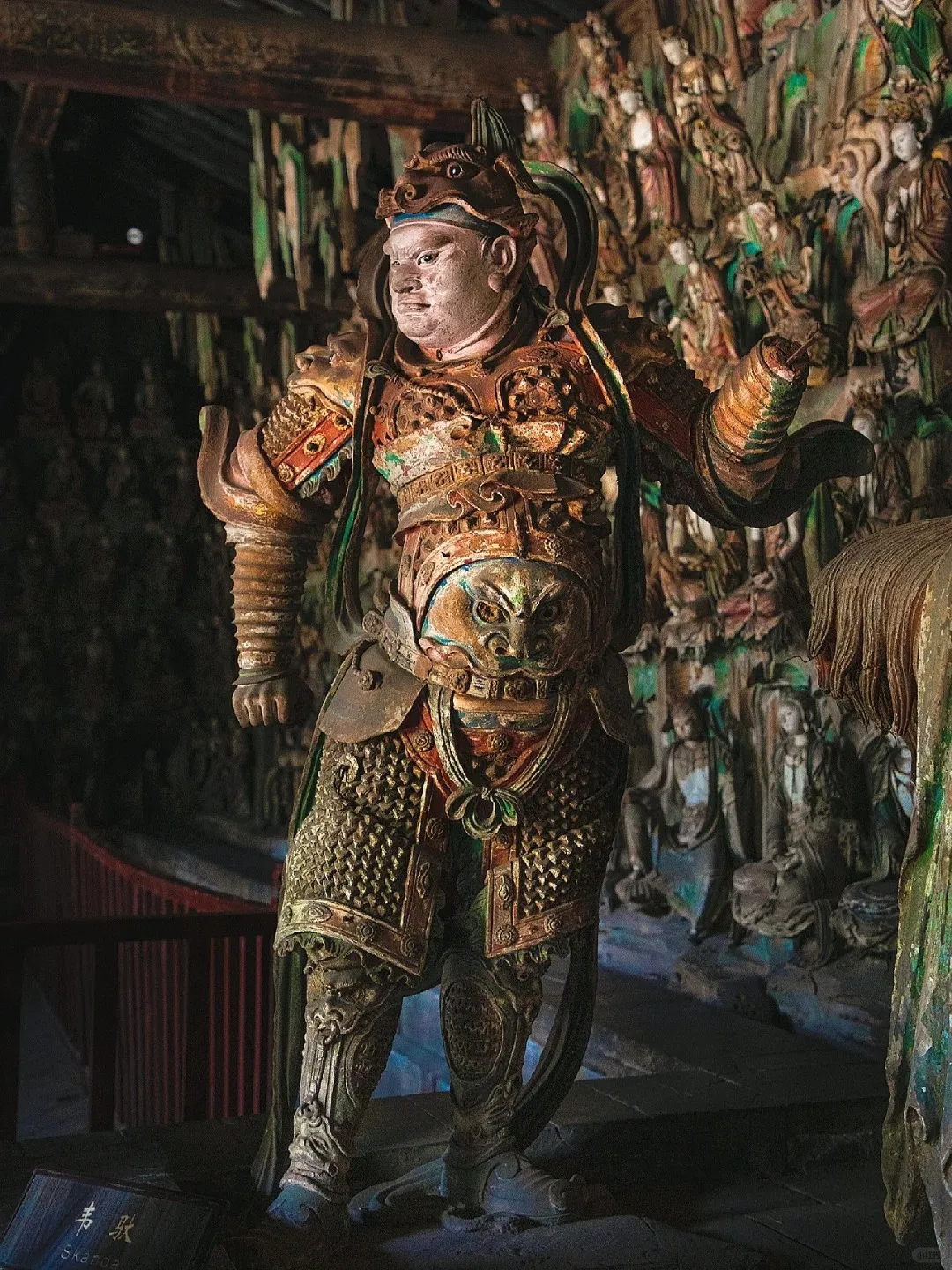 几乎是相同时代,跨越欧亚两洲,相距八千公里。大卫,高3.9米,大理石,1502年前后,米开朗基罗创的作品;韦陀,高1.6米,泥胎木塑,明代双林寺塑像,无名匠人作品。不同的文化背景,不同的材质和尺度,不同的艺术表达方式,一条奇妙的线连接彼此。大卫坚毅如铁,充满理性、写实的西方之美,而韦陀栩栩如生,饱含感性、写意的东方之美,他们都是塑像情感表达上的巅峰之作!这样的神作,在地球上任何博物馆,都是镇馆之宝!居然就在平遥县的一个农村庙宇中,躲过了600年的天灾人祸,堪称奇迹中奇迹。当年和平遥古城一起申遗的双林寺,历史地位和艺术价值都无与伦比,可惜宣传不太到位,公众认知较低,实为可惜!