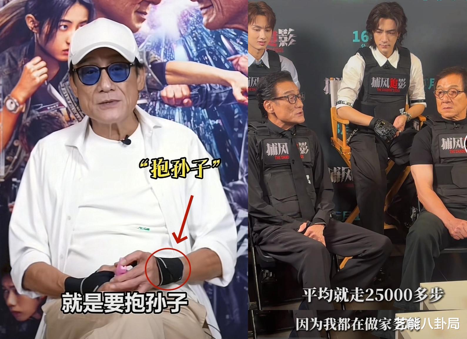 拍戏的时候,他双手戴着护腕,是因为在家要带两个外孙。