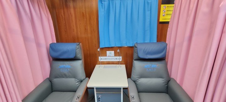 手机扫一下前台二维码,登记姓名、性别、身份证号和出发车次时间,将身份证交给工作人员登记后,就领到一张标着座位号的智能卡片。找到自己休息的沙发,旁边有智能保险柜,可以存放个人物品,还有小夜灯,USB与三孔、两孔插座。沙发宽大舒服,可以电动调节靠背和腿托。