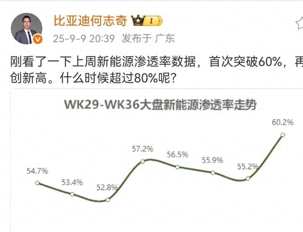 新能源渗透率首次突破60%!这个数字一出来,说实话,整个汽车圈都炸了。比亚迪何志奇在微博上直接问:"什么时候能超过80%?"看得出来,这位老兄对电车的信心是真的爆棚。
