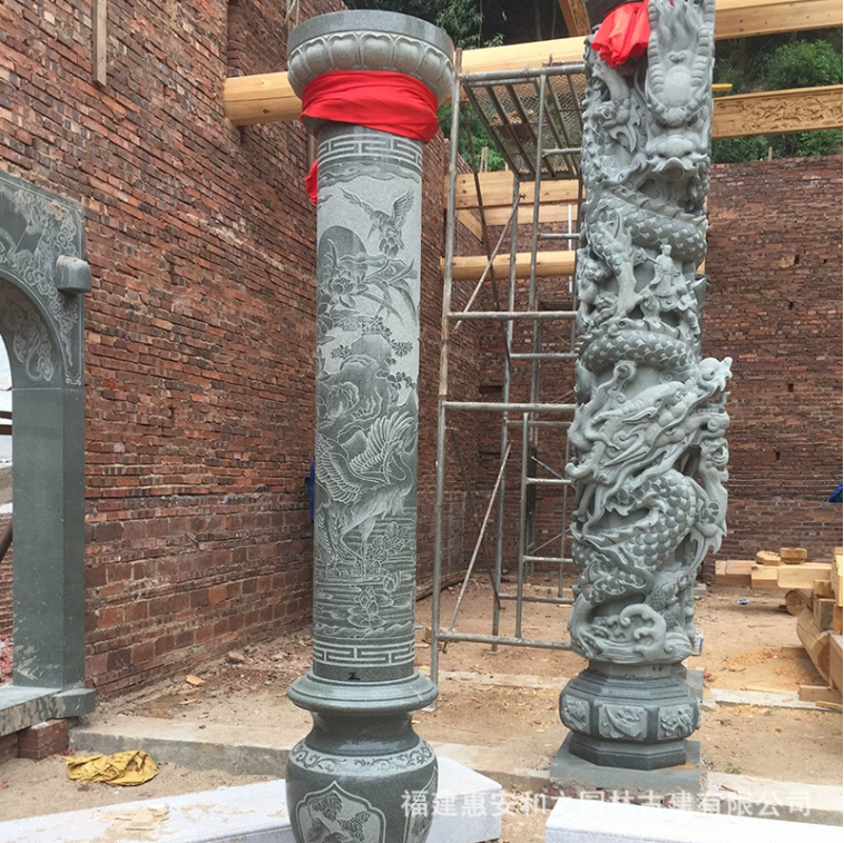 此外,盘龙柱的比例与尺寸设计要与建筑整体相协调。过高或过粗的盘龙柱可能会破坏建筑的和谐美感,而过小则难以凸显其庄重威严。需综合考虑建筑的层高、空间布局以及周围环境,精确计算盘龙柱的尺寸,使其在视觉上与建筑相得益彰,成为建筑空间中不可或缺的点睛之笔。