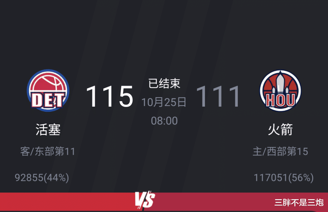 活塞:全队115分、总命中率46.7% 、三分命中率41.0%