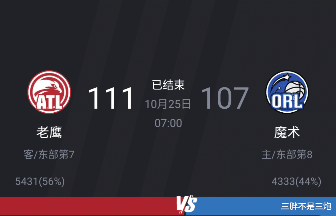 老鹰:全队111分、总命中率48.2% 、三分命中率27.6%