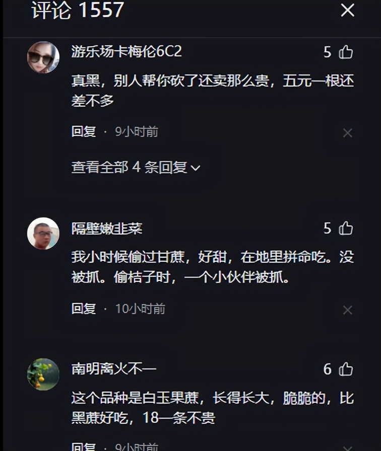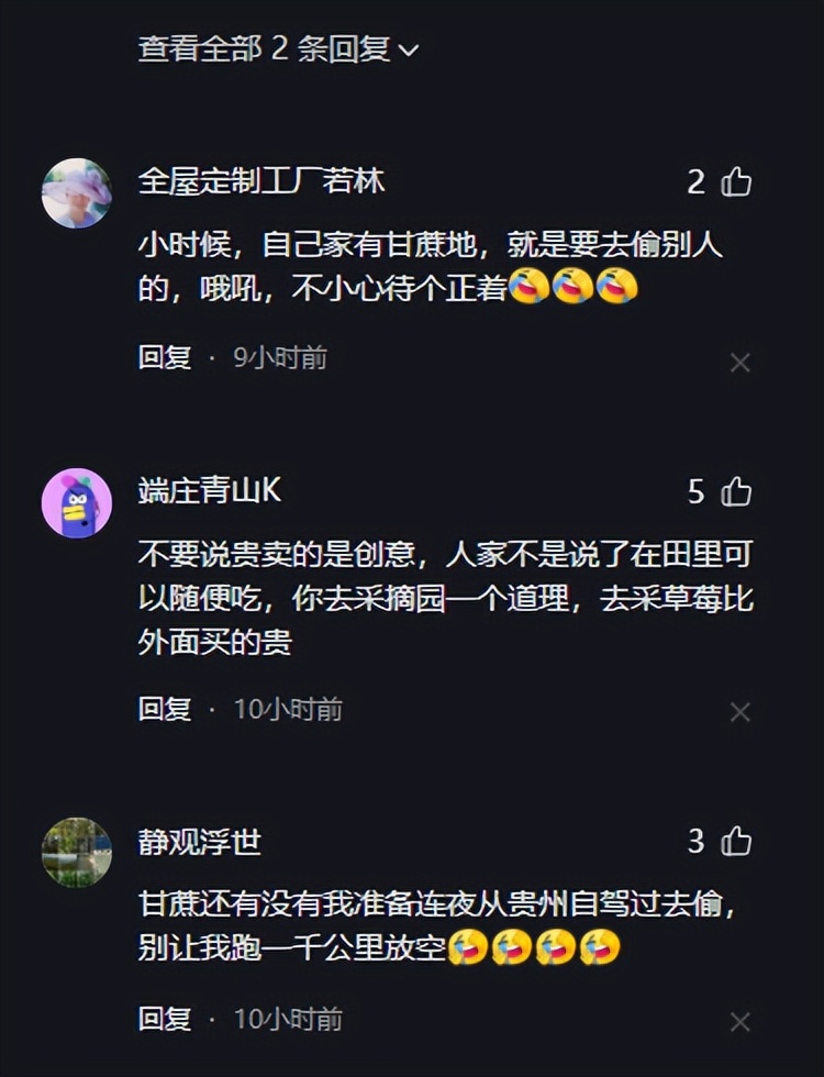 还有网友在王勇龙视频的评论区分享“偷”的乐趣,用文字描述道:“这‘偷’来的甘蔗嘎嘎甜”“付一根吃三根”“做了一次不用紧张的贼”……