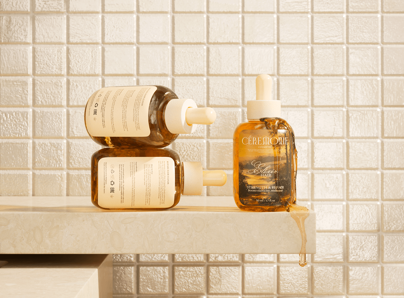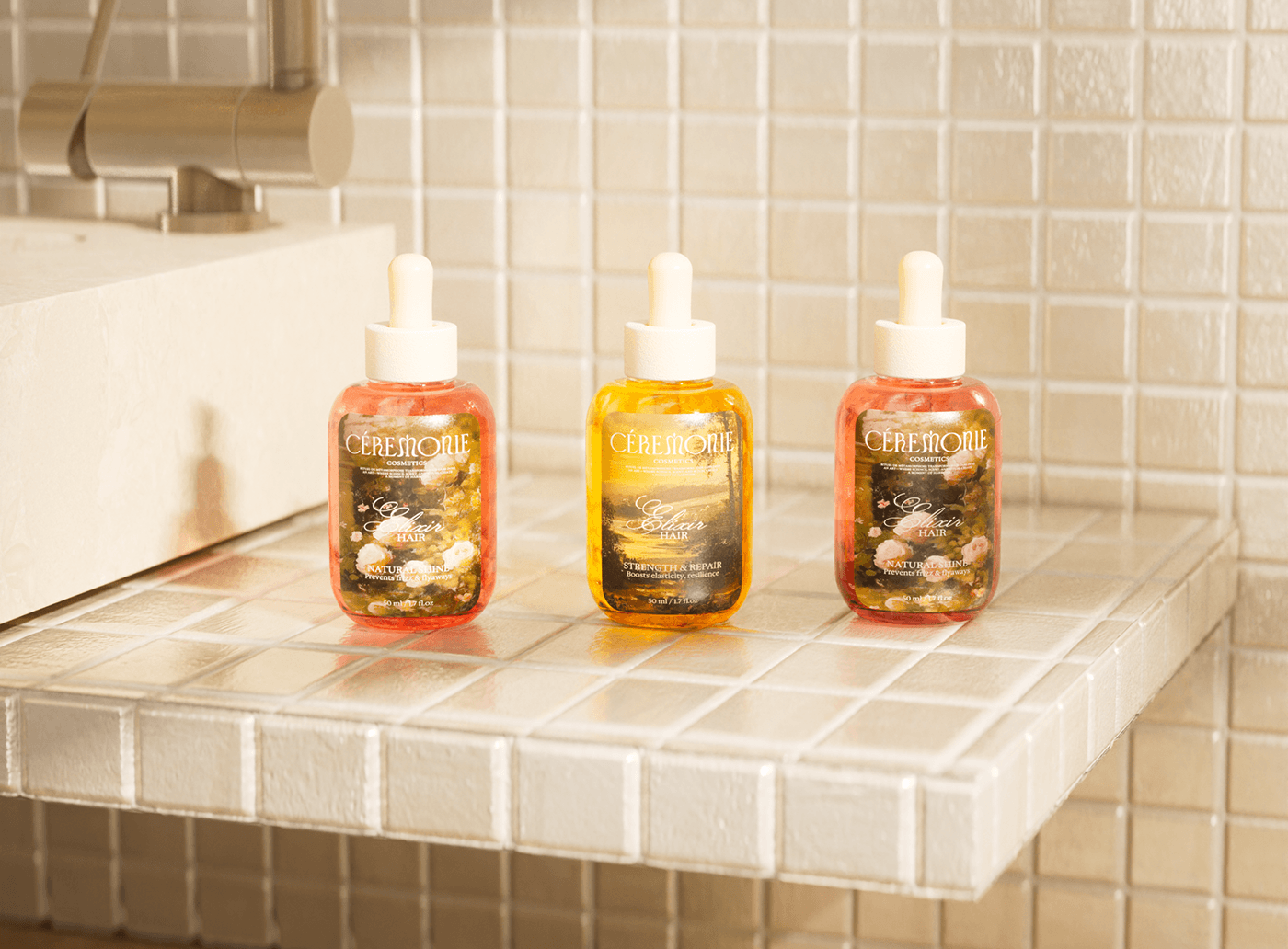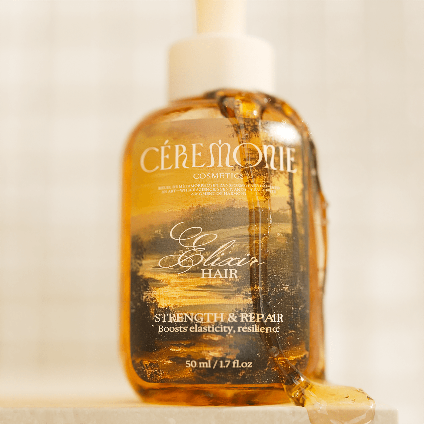 最抓眼球的是那款琥珀色护发精油!瓶身通透得能看见液体流动,白色瓶盖像一颗圆润珍珠,而标签上的艺术化风景图案根本是幅微型油画——手写风的“Elixir HAIR”(头发精华液)像艺术家签名,下方“Boosts elasticity, resilience”(提升弹性与韧性)的效用说明,搭配“50ml/1.7fl.oz”的精致容量标注,直接把护发精油从“护理品”变成“值得收藏的美妆单品”。