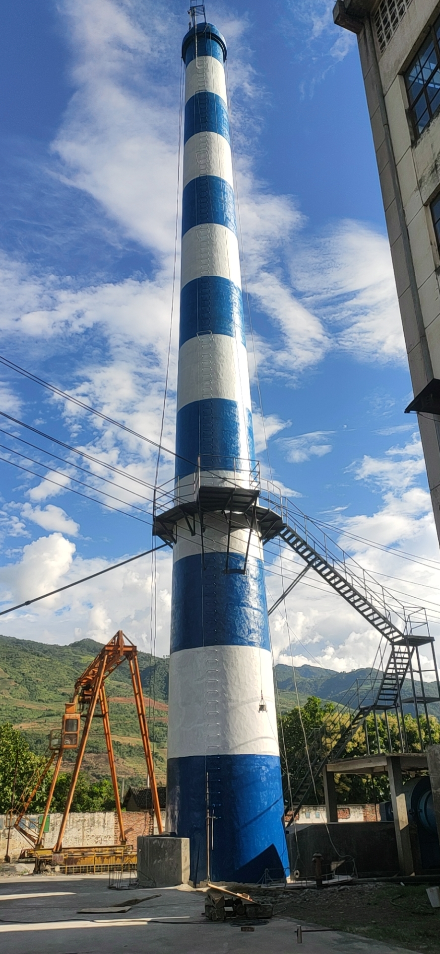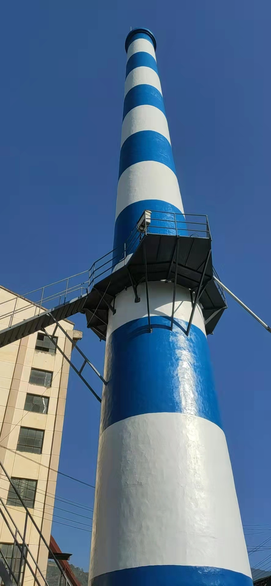 从烟囱顶部向下量尺,按设计高度划分色环宽度(常规每段 1.5~2m)。