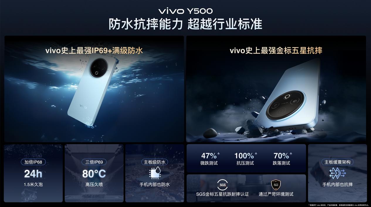 首先要夸夸它顶天的防护能力。IP68/69/69+满级防水,不管是突然下雨还是意外泡水,都能从容应对。金刚磐石架构+SGS五星抗摔认证,意味着日常跌落基本不叫事。对于经常在户外工作、喜欢露营登山,或者单纯是手残党的小伙伴来说,vivo Y500简直就是为你量身定做的“金刚护体”神器。