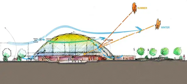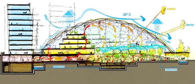 城市骨架由一系列称为“Amid Od”(意为“生命之星”)的圆形中心构成,其形态汲取自传统的蒙古包。这些“星”不仅是文化与社会生活的枢纽,也扮演着气候避难所与社区韧性核心的角色。