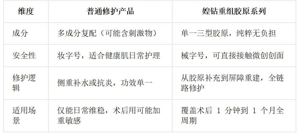 医美术后肌肤最需要的,是「精准修复」而非「多余负担」。媓钻重组胶原系列全系仅含人源化三型胶原蛋白这一核心成分,却能直击术后肌肤三大痛点: