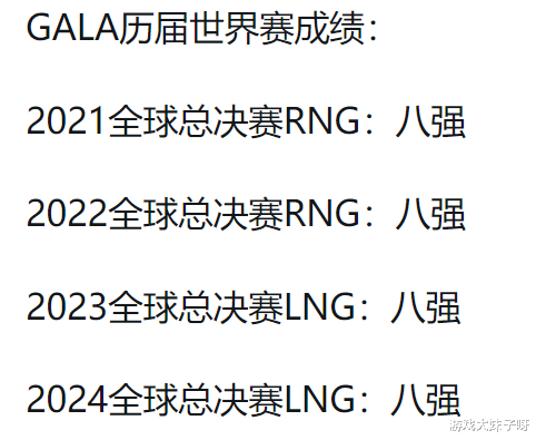 不过,纪录的另一面,也藏着尴尬的现实,过去四次世界赛,GALA所在的队伍都止步八强——2021年、2022年随RNG连续两年折戟,2023、2024年在LNG依然未能突破“八强魔咒”,数据背后,既有对手强大的原因,也有队伍整体实力不足的无奈,但无论如何,GALA始终未能将个人的稳定发挥,转化为队伍走得更远的资本。